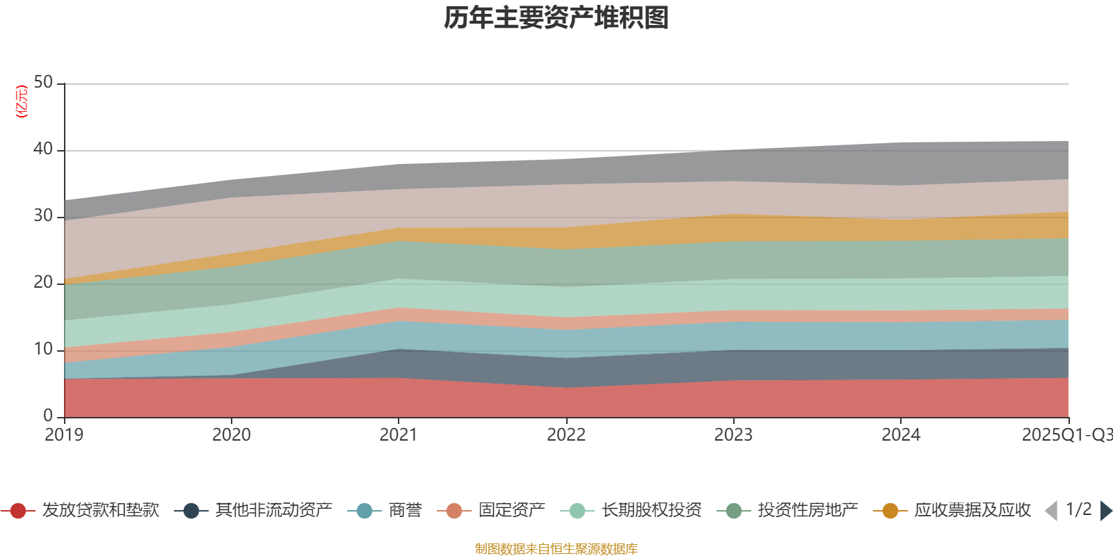 资产重大变化方面,截至2025年三季度末,公司应收票据及应收账款较上年末增加26.5%,占公司总资产比重上升1.99个百分点;划分为持有待售的资产较上年末减少100%,占公司总资产比重下降1.6个百分点;一年内到期的非流动资产较上年末减少20.42%,占公司总资产比重下降1个百分点;货币资金较上年末减少4.48%,占公司总资产比重下降0.62个百分点。