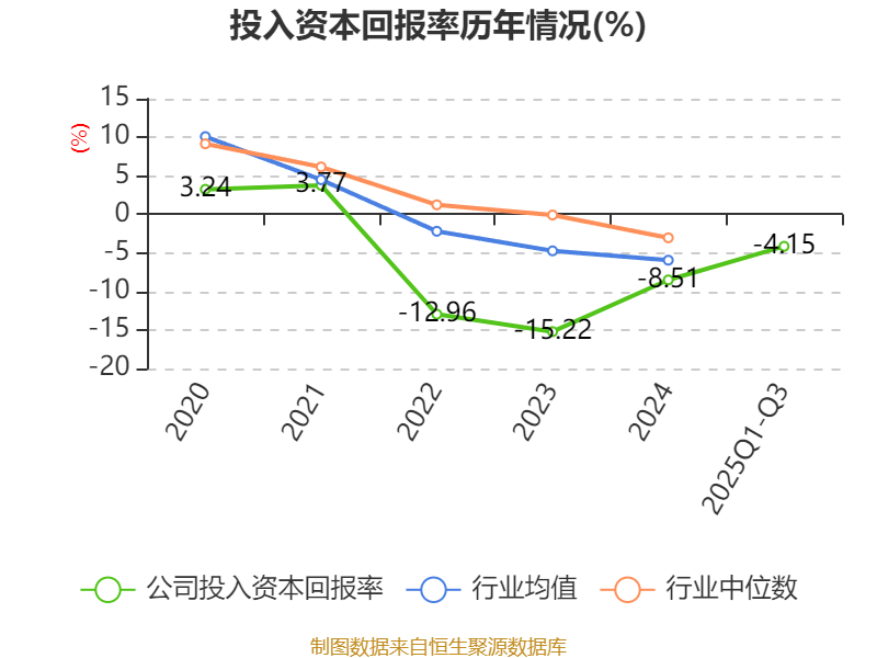 盈利能力方面, 2025年前三季度公司加权平均净资产收益率为-8.22%,同比下降0.79个百分点。公司2025年前三季度投入资本回报率为-4.15%,较上年同期上升0.19个百分点。