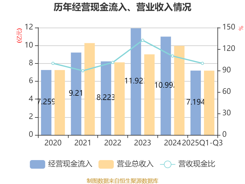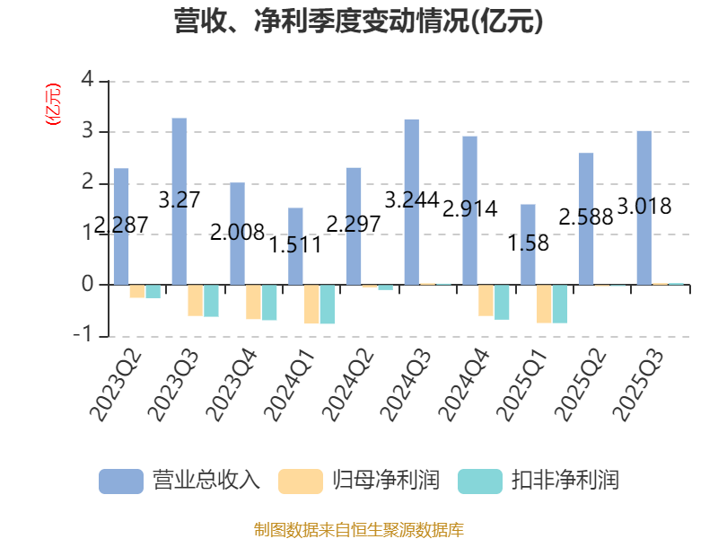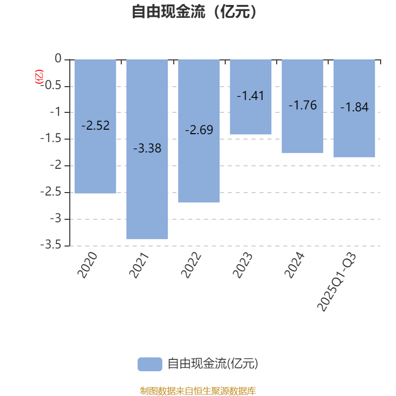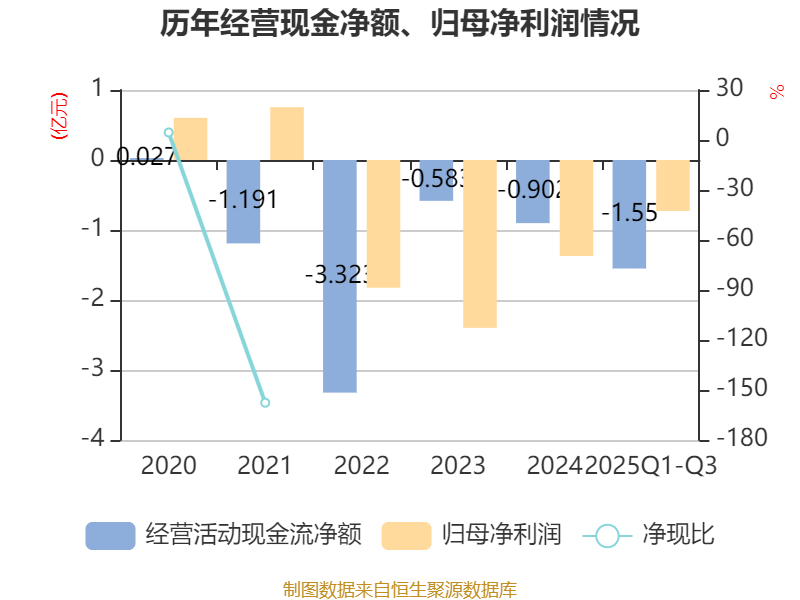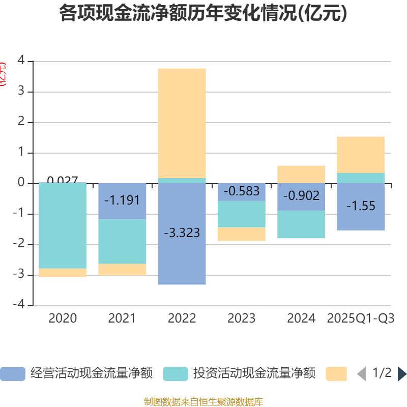 2025年前三季度,公司经营活动现金流净额为-1.55亿元,同比减少5878.59万元;筹资活动现金流净额1.19亿元,同比增加5529.16万元;投资活动现金流净额3329.23万元,上年同期为-1.07亿元。
