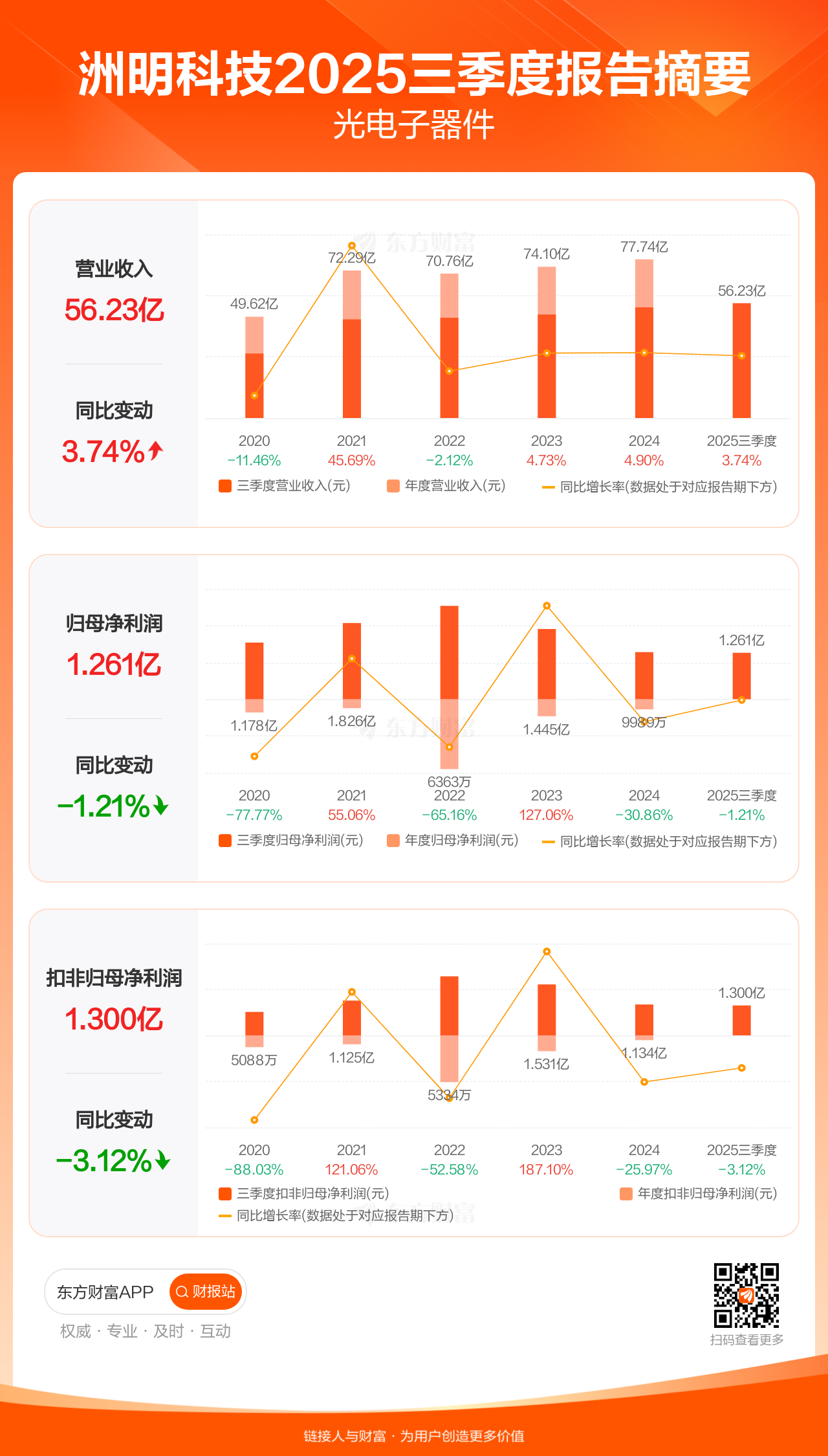 洲明科技10月30日发布2025年三季报显示,公司前三季实现营业收入56.23亿元,同比增长3.74%;归母净利润1.26亿元,同比下滑1.21%;扣非归母净利润1.30亿元,同比下滑3.12%。