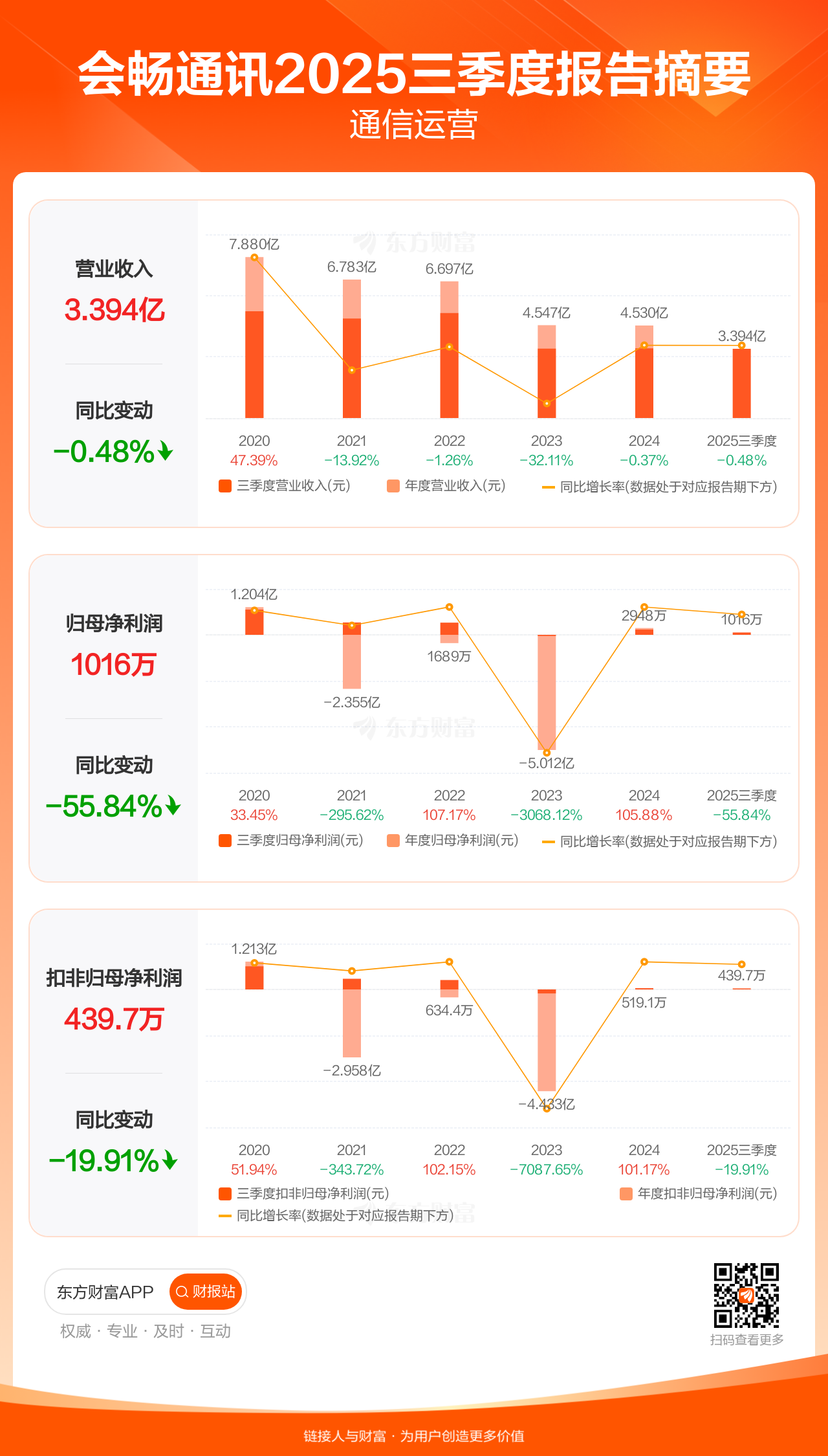 会畅通讯10月23日发布2025年三季报显示,公司前三季实现营业收入3.39亿元,同比下滑0.48%;归母净利润1015.57万元,同比下滑55.84%;扣非归母净利润439.65万元,同比下滑19.91%。