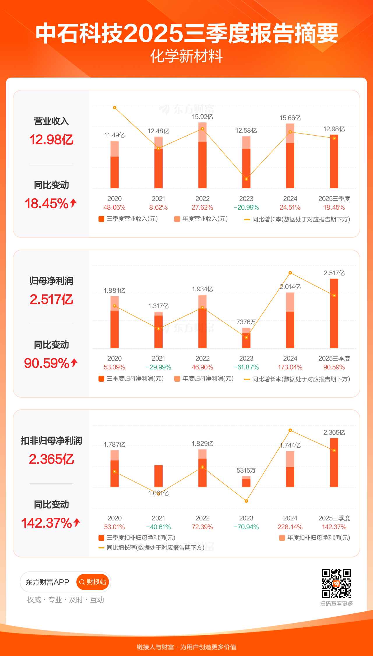 中石科技10月30日发布2025年三季报显示,公司前三季实现营业收入12.98亿元,同比增长18.45%;归母净利润2.52亿元,同比增长90.59%;扣非归母净利润2.36亿元,同比增长142.37%。