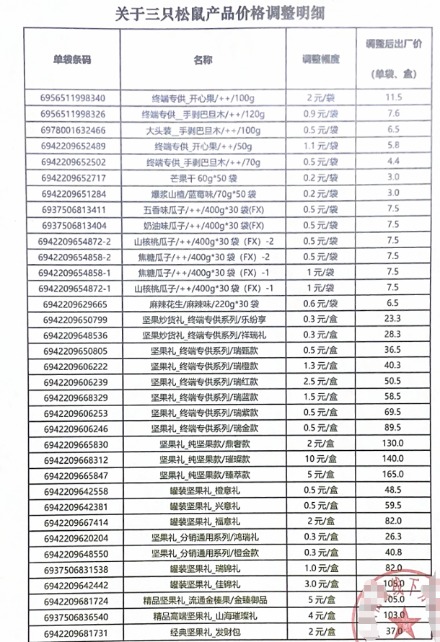 目前,零售终端称仍未接到通知。21财经·南财快讯记者向三只松鼠网上旗舰店客服咨询时,对方回复“目前没有(接到调价)通知。”