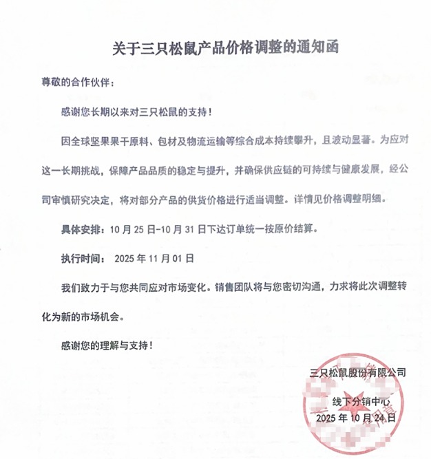 三只松鼠同时表示,在10月25日至10月31日期间下单的订单仍按原价结算,以给予合作伙伴一定的缓冲期。