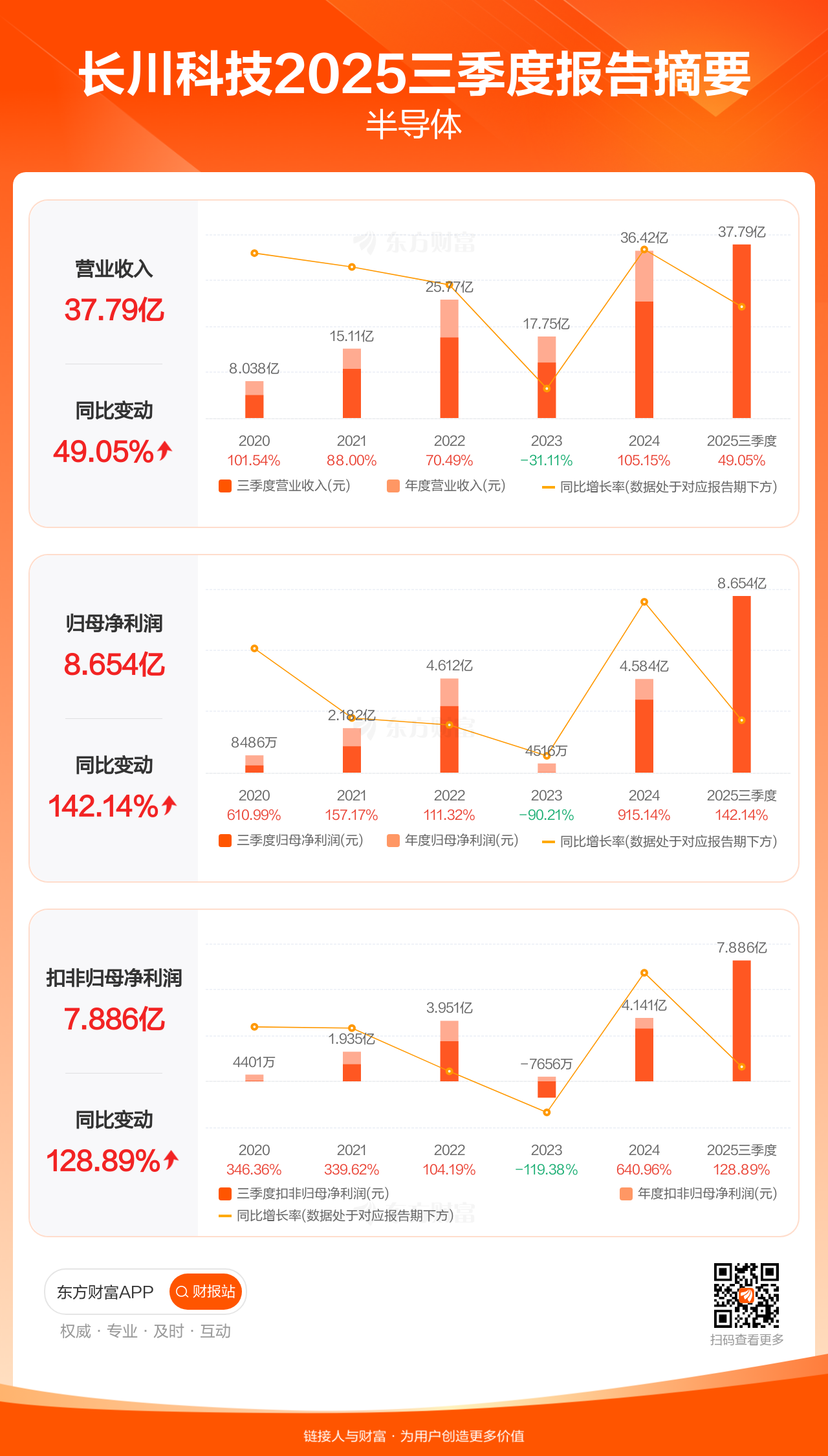 长川科技10月30日发布2025年三季报显示,公司前三季实现营业收入37.79亿元,同比增长49.05%;归母净利润8.65亿元,同比增长142.14%;扣非归母净利润7.89亿元,同比增长128.89%。