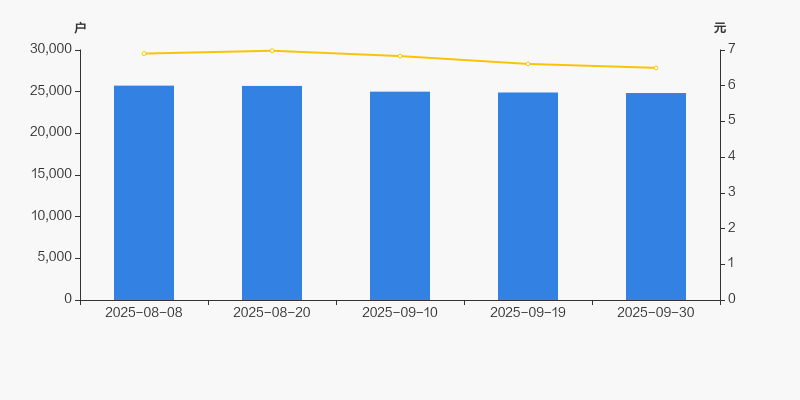 自2025年8月8日以来,公司股东户数连续4期下降,截至目前减幅为3.45%。2025年8月8日至2025年9月30日区间股价下降5.80%。