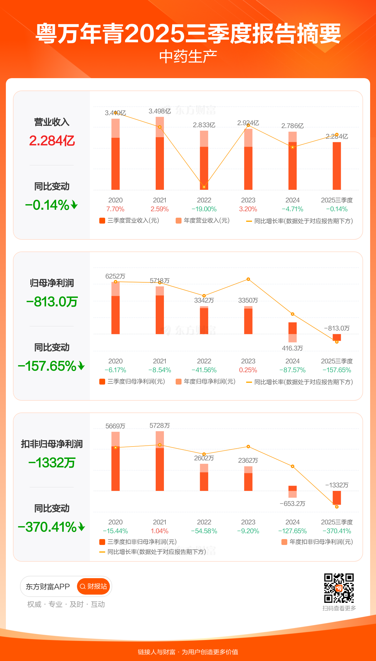 粤万年青10月30日发布2025年三季报显示,公司前三季实现营业收入2.28亿元,同比下滑0.14%;归母净利润-812.95万元;扣非归母净利润-1331.86万元。