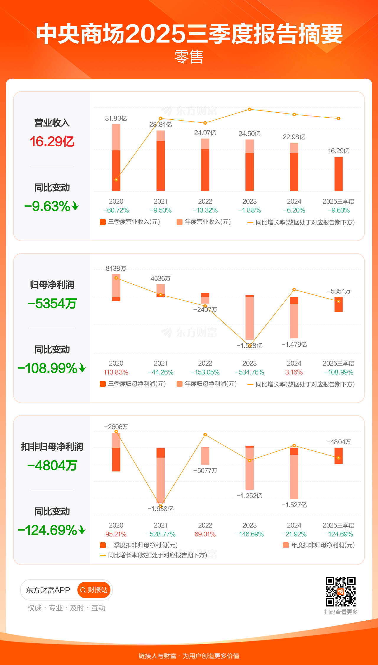 中央商场10月30日发布2025年三季报显示,公司前三季实现营业收入16.29亿元,同比下滑9.63%;归母净利润-5353.79万元;扣非归母净利润-4803.51万元。