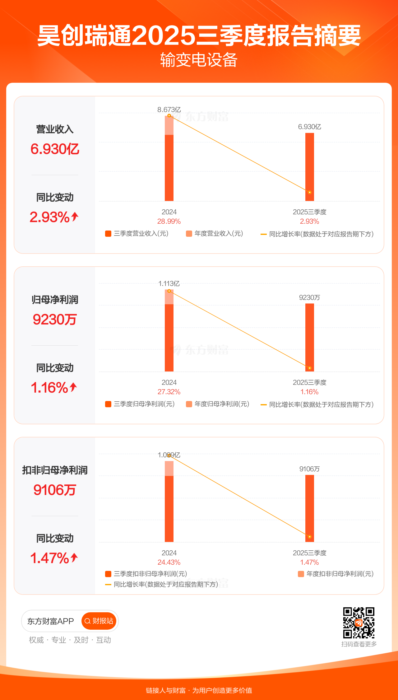 昊创瑞通10月30日发布2025年三季报显示,公司前三季实现营业收入6.93亿元,同比增长2.93%;归母净利润9229.66万元,同比增长1.16%;扣非归母净利润9105.51万元,同比增长1.47%。