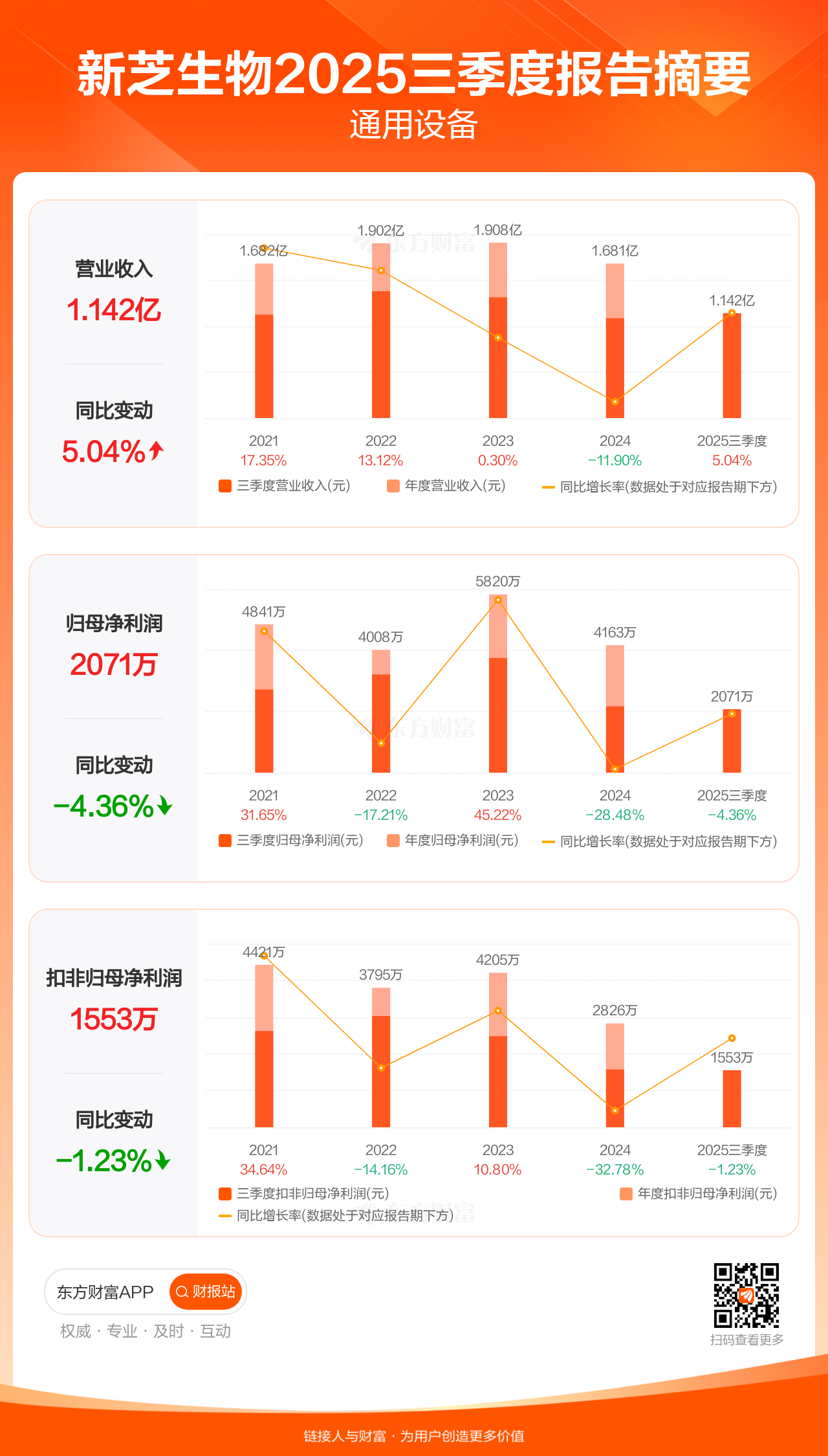 新芝生物10月29日发布2025年三季报显示,公司前三季实现营业收入1.14亿元,同比增长5.04%;归母净利润2070.91万元,同比下滑4.36%;扣非归母净利润1553.08万元,同比下滑1.23%。