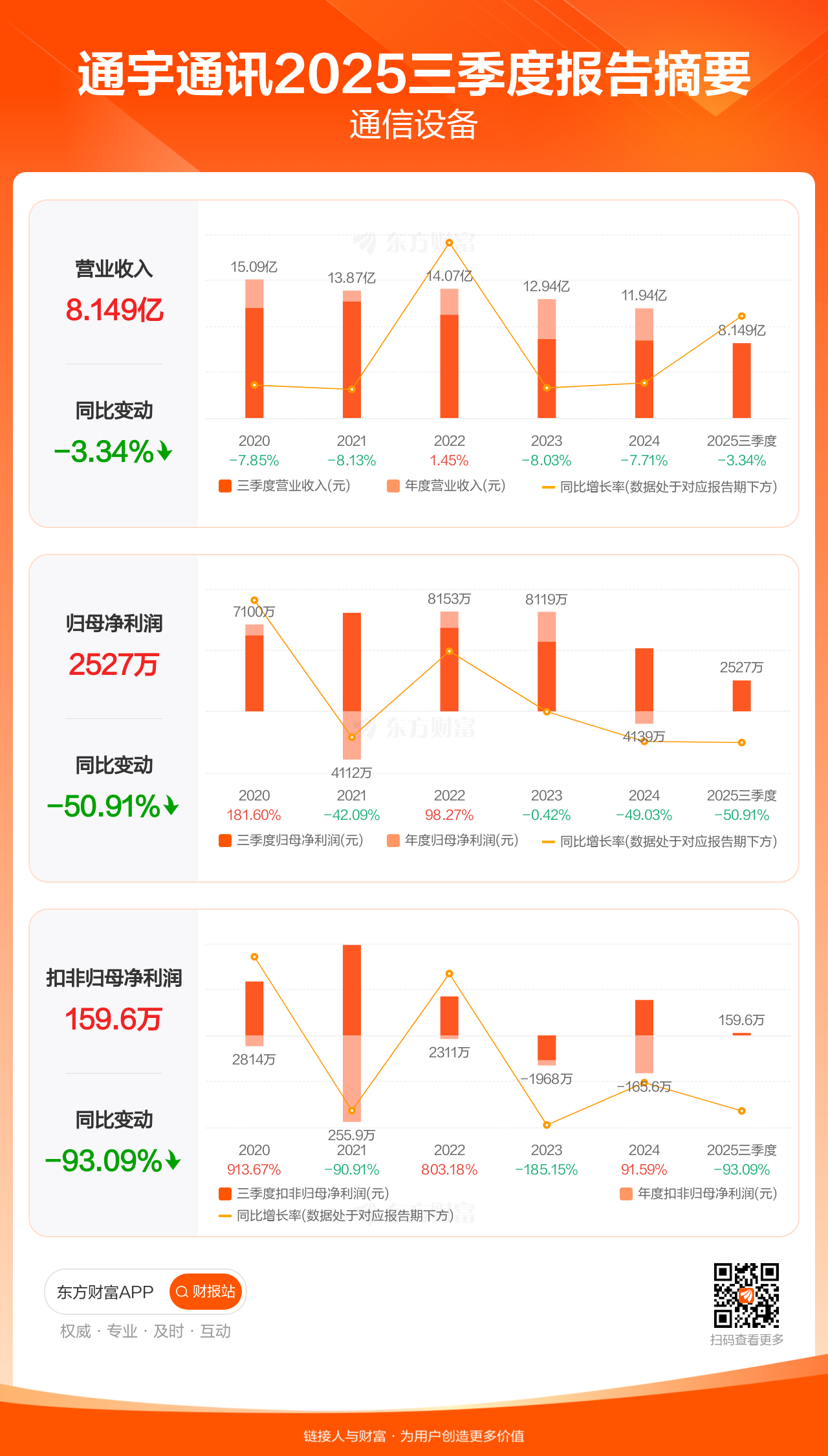 通宇通讯10月30日发布2025年三季报显示,公司前三季实现营业收入8.15亿元,同比下滑3.34%;归母净利润2527.46万元,同比下滑50.91%;扣非归母净利润159.61万元,同比下滑93.09%。