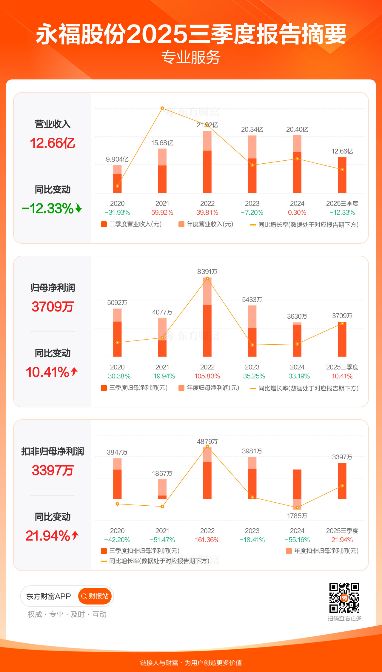 永福股份10月30日发布2025年三季报显示,公司前三季实现营业收入12.66亿元,同比下滑12.33%;归母净利润3709.24万元,同比增长10.41%;扣非归母净利润3397.02万元,同比增长21.94%。