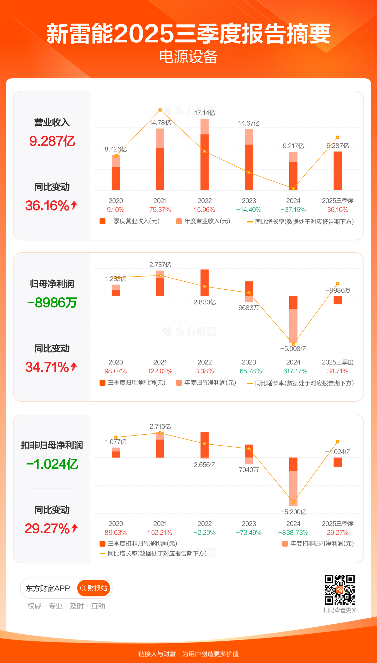 新雷能10月30日发布2025年三季报显示,公司前三季实现营业收入9.29亿元,同比增长36.16%;归母净利润-8985.64万元;扣非归母净利润-1.02亿元。