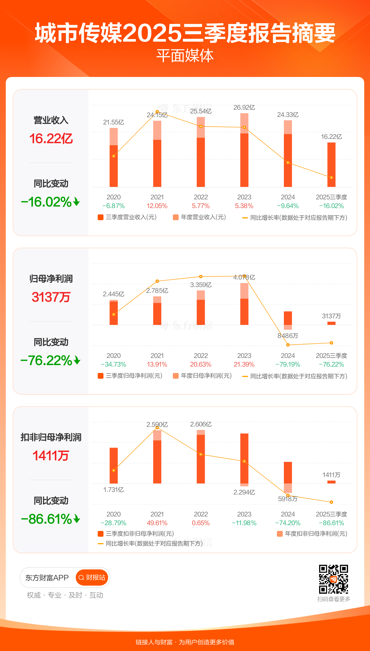 城市传媒10月30日发布2025年三季报显示,公司前三季实现营业收入16.22亿元,同比下滑16.02%;归母净利润3136.54万元,同比下滑76.22%;扣非归母净利润1410.81万元,同比下滑86.61%。