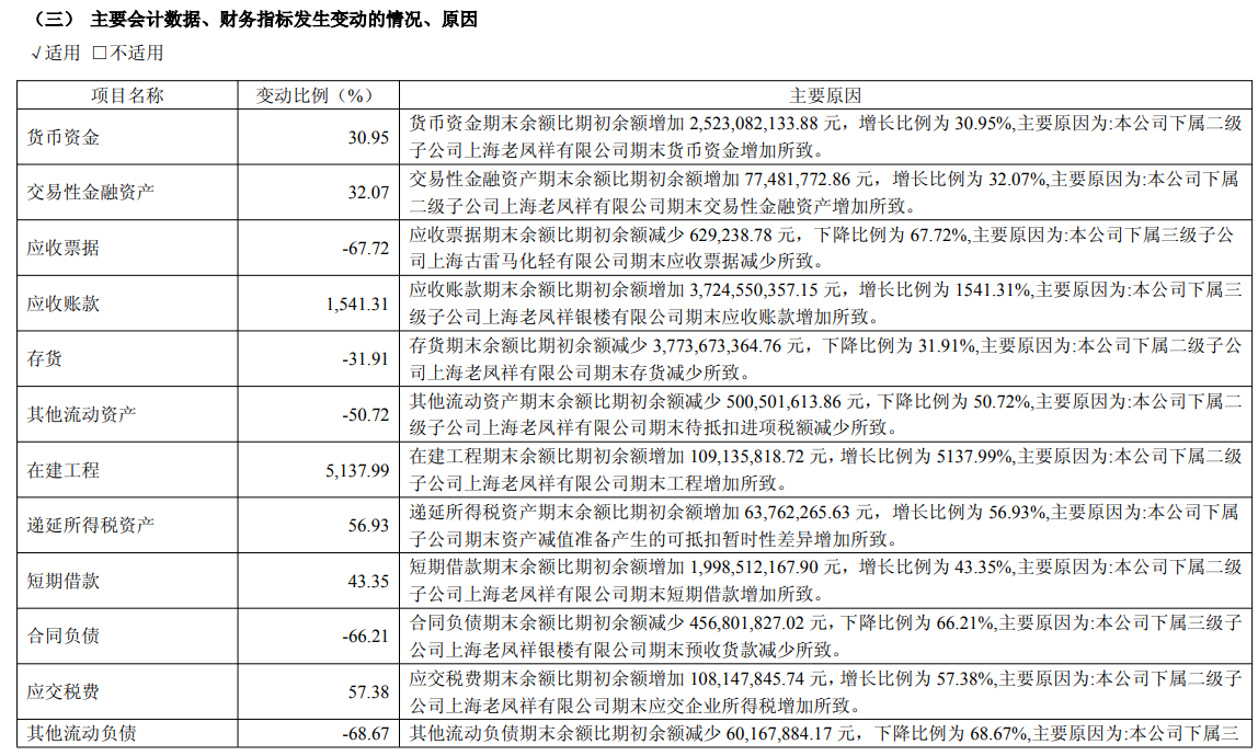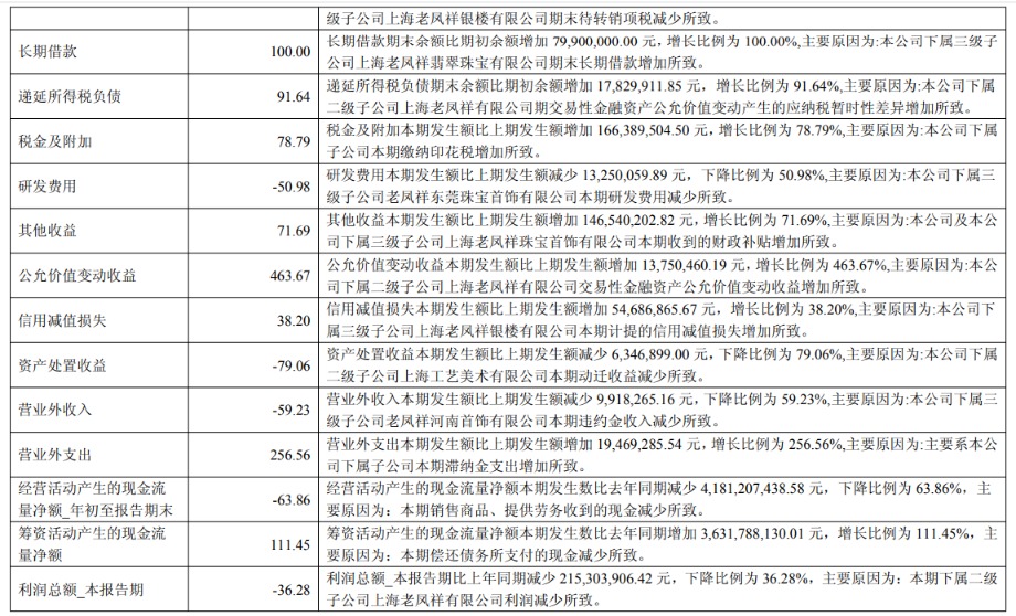在三季报中,老凤祥对公司报告期众多会计数据、财务指标发生变动的情况、原因做了解释说明。