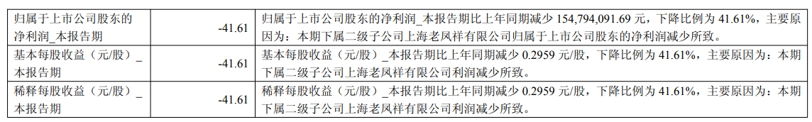 三季报显示,公司归属于上市公司股东的净利润本报告期比上年同期减少1.55亿元,下降比例为41.61%,主要原因系本期下属二级子公司上海老凤祥有限公司归属于上市公司股东的净利润减少所致;经营活动产生的现金流量净额本期发生数比去年同期减少41.81亿元,下降比例为63.86%,主要原因系本期销售商品、提供劳务收到的现金减少所致;货币资金期末余额比期初余额增加25.23亿元,增长比例为30.95%,主要原因系本公司下属二级子公司上海老凤祥有限公司期末货币资金增加所致;交易性金融资产期末余额比期初余额增加7748万元,增长比例为32.07%,主要系本公司下属二级子公司上海老凤祥有限公司期末交易性金融资产增加所致;应收账款期末余额比期初余额增加37.25亿元,增长比例为1541.31%,主要系本公司下属三级子公司上海老凤祥银楼有限公司期末应收账款增加所致;存货期末余额比期初余额减少37.74亿元,下降比例为31.91%,主要原因系本公司下属二级子公司上海老凤祥有限公司期末存货减少所致;短期借款期末余额比期初余额增加近20亿元,增长比例为43.35%,主要原因系本公司下属二级子公司上海老凤祥有限公司期末短期借款增加所致;合同负债期末余额比期初余额减少4.57亿元,下降比例为66.21%,主要原因系本公司下属三级子公司上海老凤祥银楼有限公司期末预收货款减少所致。