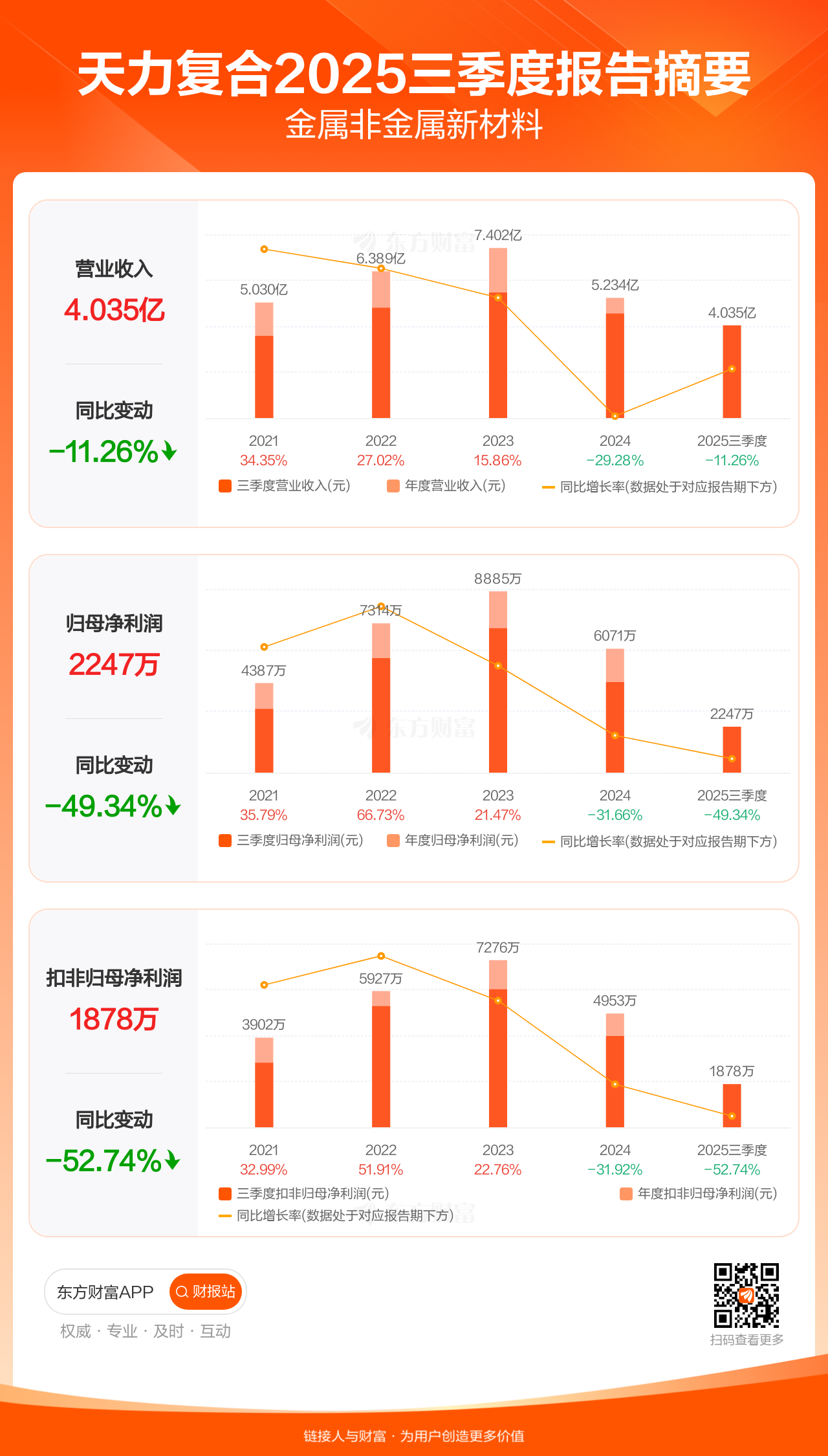 天力复合10月29日发布2025年三季报显示,公司前三季实现营业收入4.04亿元,同比下滑11.26%;归母净利润2246.93万元,同比下滑49.34%;扣非归母净利润1878.40万元,同比下滑52.74%。