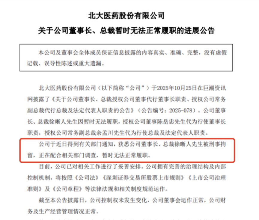 北大医药在最新公告中表示,目前已对相关工作进行了妥善安排,控制权未发生变化,董事会运作正常,财务及生产经营管理情况正常。截至本公告披露日,公司尚未知悉相关调查的进展及结论,公司将持续关注上述事项的后续情况,并及时履行信息披露义务。