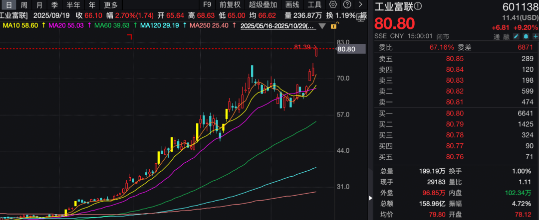 工业富联披露财报当日,该公司股价大涨9.2%,盘中一度涨停,最新股价为80.80元/股,总市值16045亿元。
