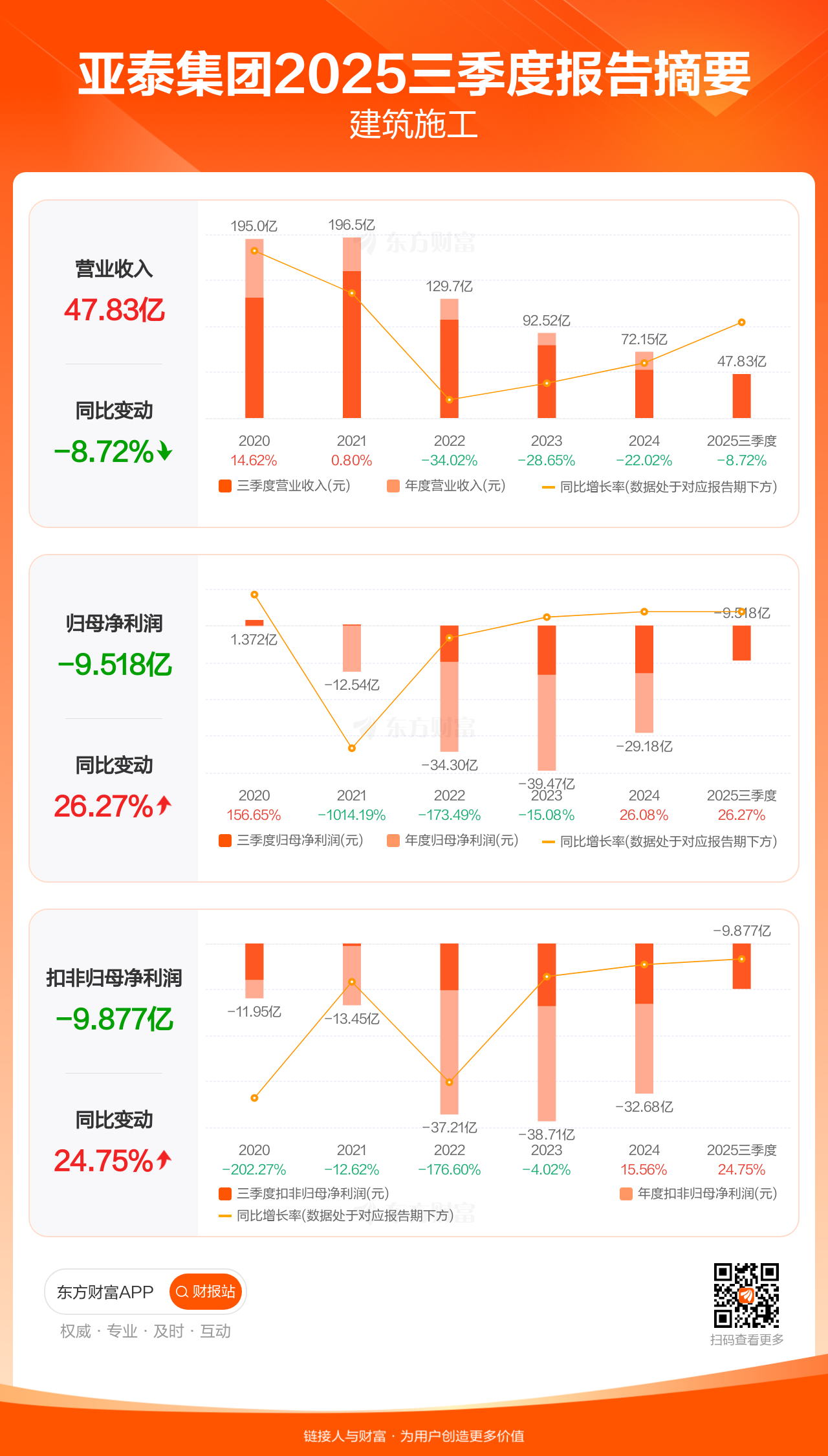 亚泰集团10月30日发布2025年三季报显示,公司前三季实现营业收入47.83亿元,同比下滑8.72%;归母净利润-9.52亿元;扣非归母净利润-9.88亿元。