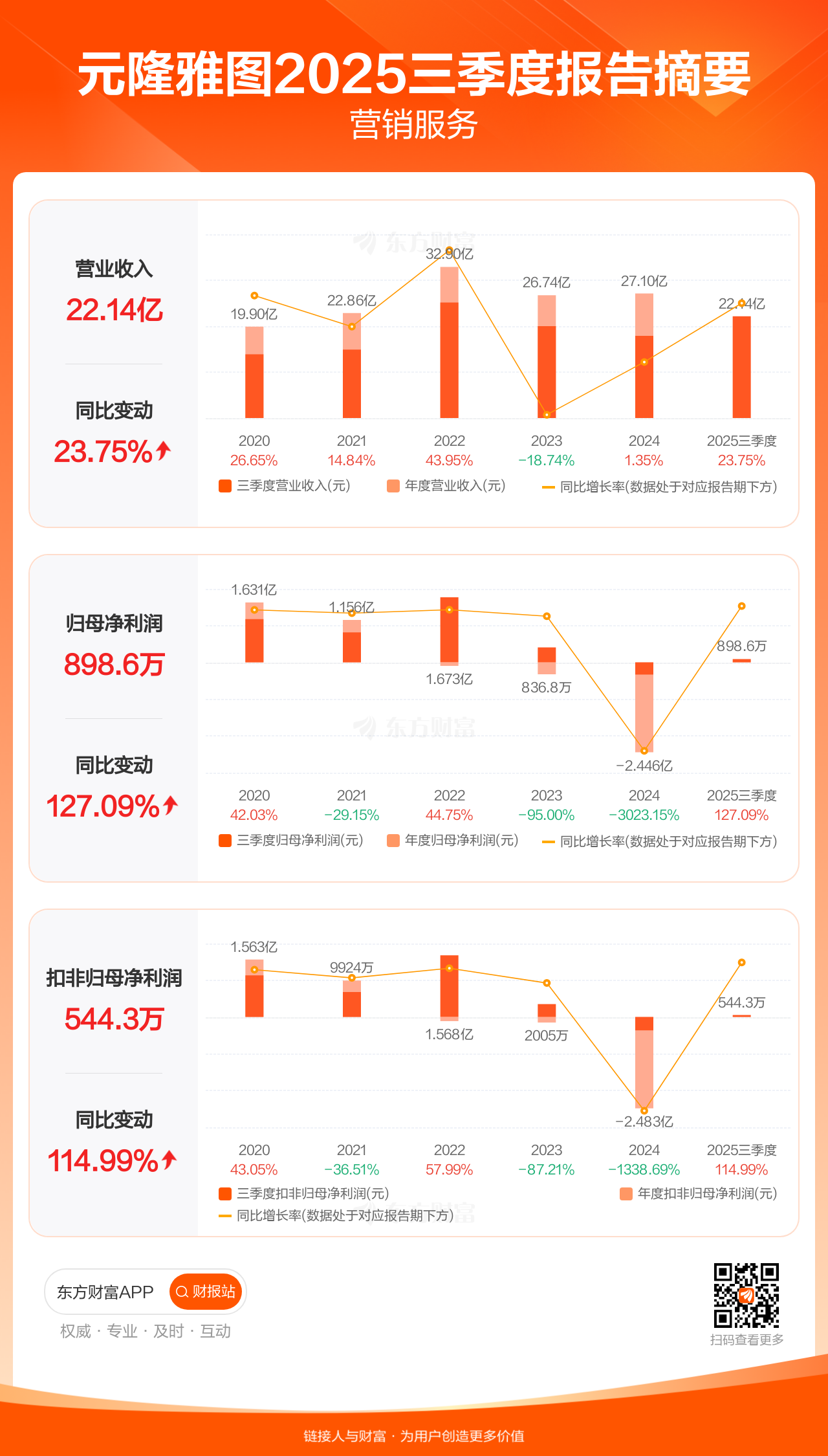 元隆雅图10月30日发布2025年三季报显示,公司前三季实现营业收入22.14亿元,同比增长23.75%;归母净利润898.57万元,同比增长127.09%;扣非归母净利润544.28万元,同比增长114.99%。