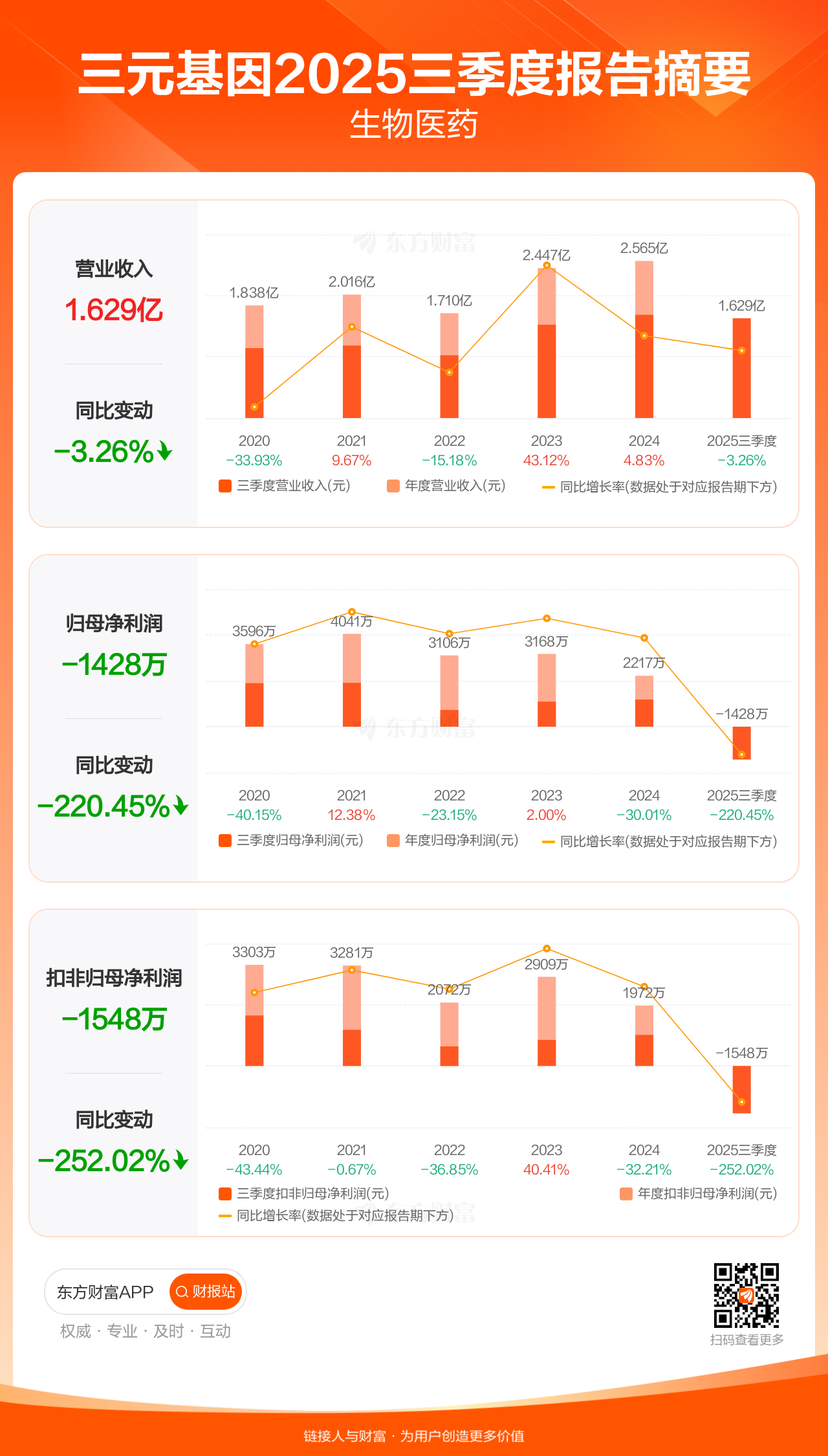 三元基因10月29日发布2025年三季报显示,公司前三季实现营业收入1.63亿元,同比下滑3.26%;归母净利润-1427.92万元;扣非归母净利润-1547.99万元。