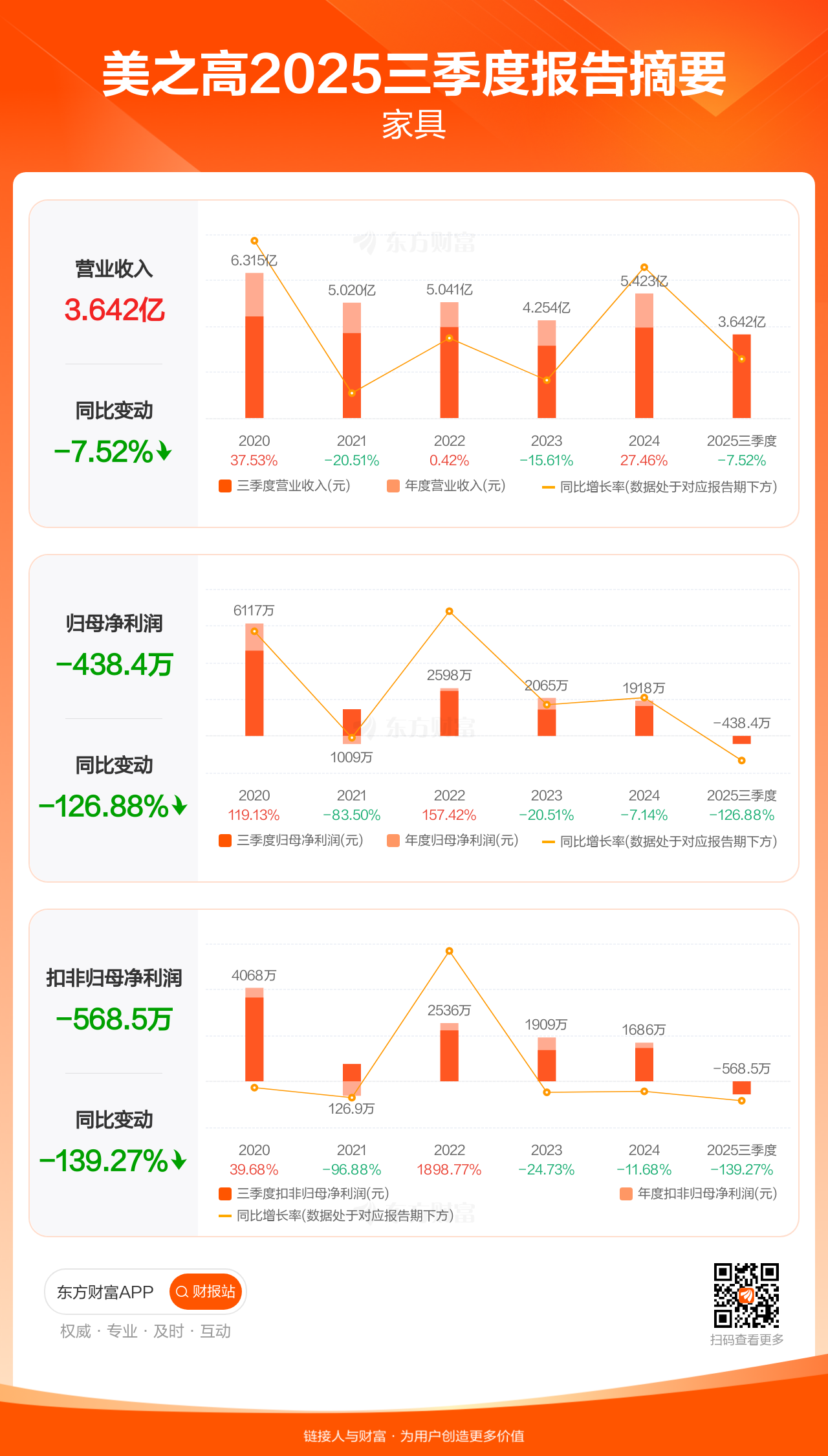 美之高10月29日发布2025年三季报显示,公司前三季实现营业收入3.64亿元,同比下滑7.52%;归母净利润-438.37万元;扣非归母净利润-568.54万元。