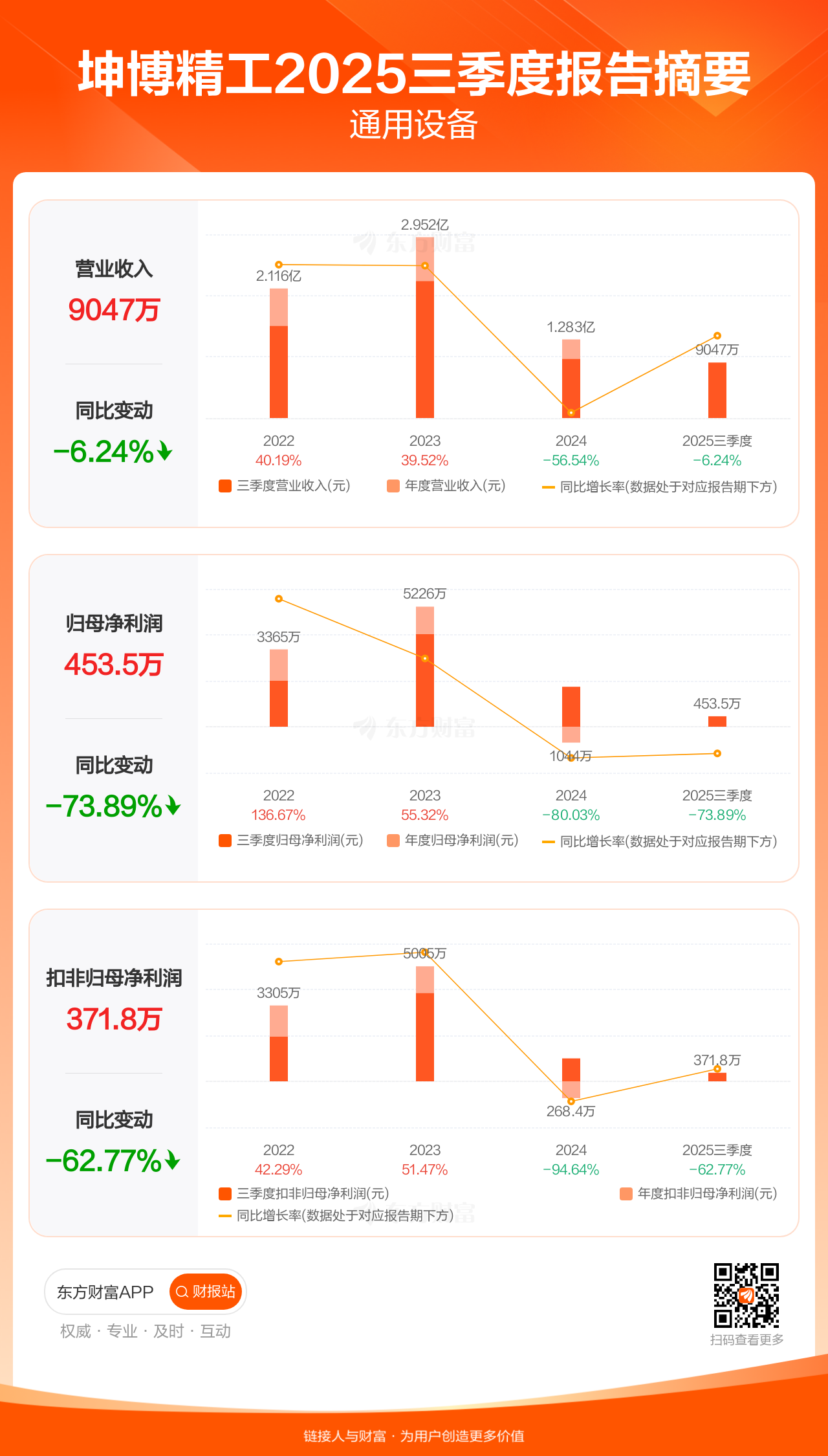 坤博精工10月29日发布2025年三季报显示,公司前三季实现营业收入9046.64万元,同比下滑6.24%;归母净利润453.47万元,同比下滑73.89%;扣非归母净利润371.84万元,同比下滑62.77%。