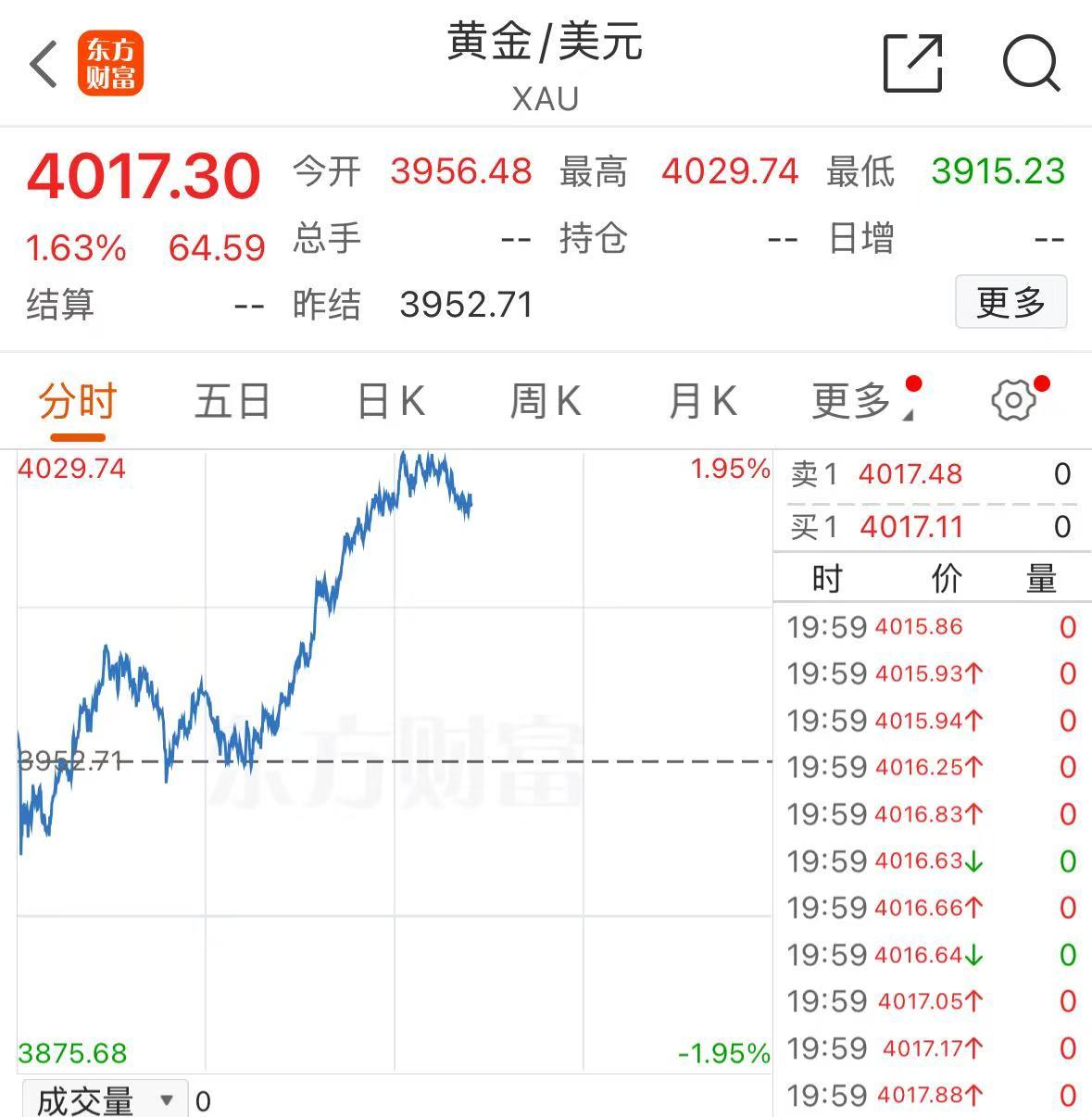 10月29日,现货黄金升破4000美元/盎司,日内上涨1.25%。截至发稿,现货黄金报4017.3美元/盎司。