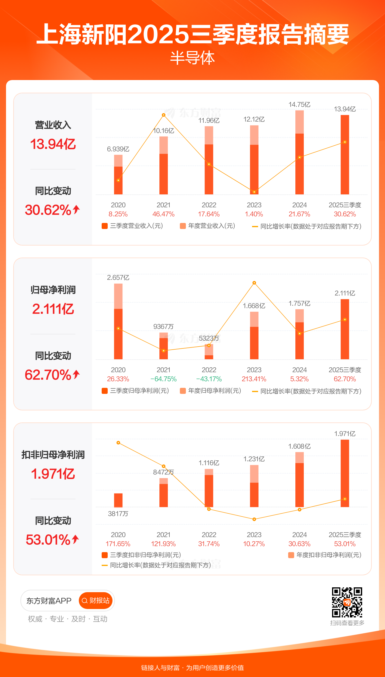 上海新阳10月30日发布2025年三季报显示,公司前三季实现营业收入13.94亿元,同比增长30.62%;归母净利润2.11亿元,同比增长62.70%;扣非归母净利润1.97亿元,同比增长53.01%。