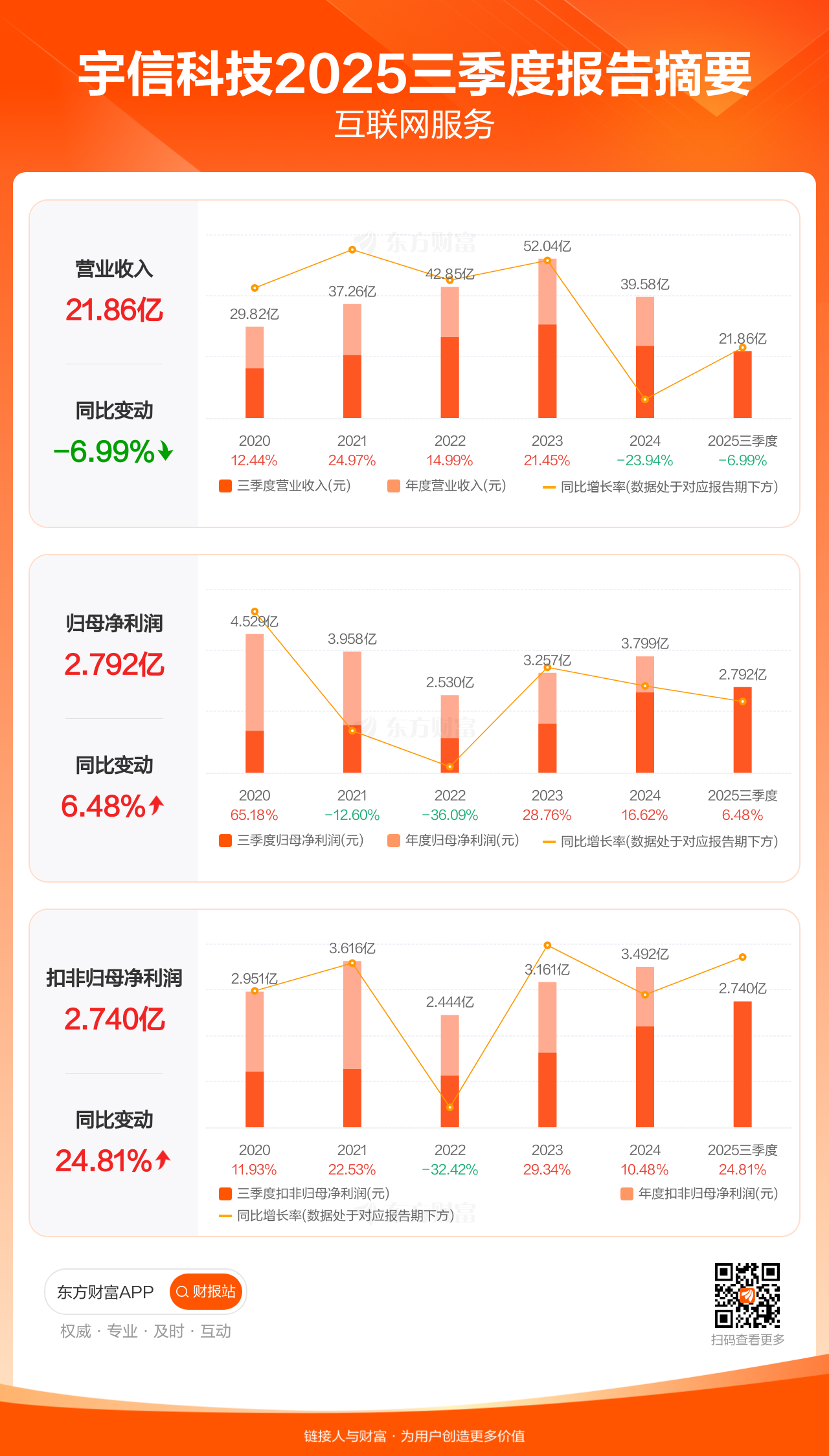 宇信科技10月30日发布2025年三季报显示,公司前三季实现营业收入21.86亿元,同比下滑6.99%;归母净利润2.79亿元,同比增长6.48%;扣非归母净利润2.74亿元,同比增长24.81%。