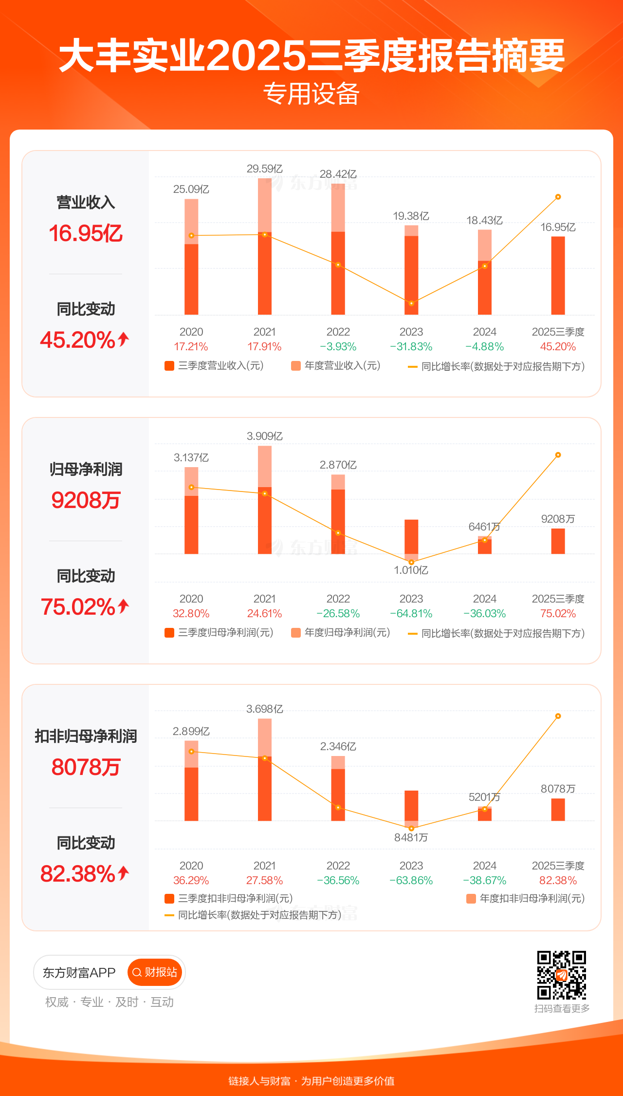 大丰实业10月30日发布2025年三季报显示,公司前三季实现营业收入16.95亿元,同比增长45.20%;归母净利润9208.45万元,同比增长75.02%;扣非归母净利润8077.50万元,同比增长82.38%。