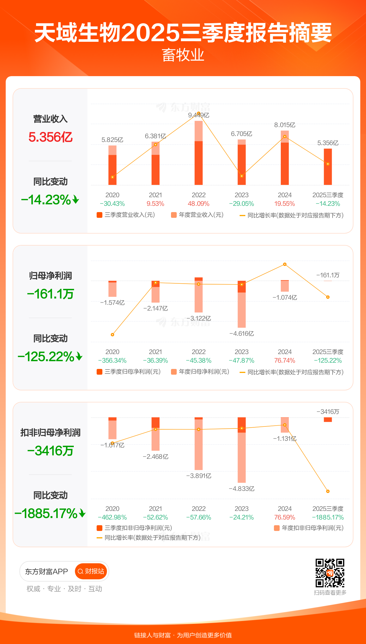 天域生物10月30日发布2025年三季报显示,公司前三季实现营业收入5.36亿元,同比下滑14.23%;归母净利润-161.09万元;扣非归母净利润-3415.78万元。