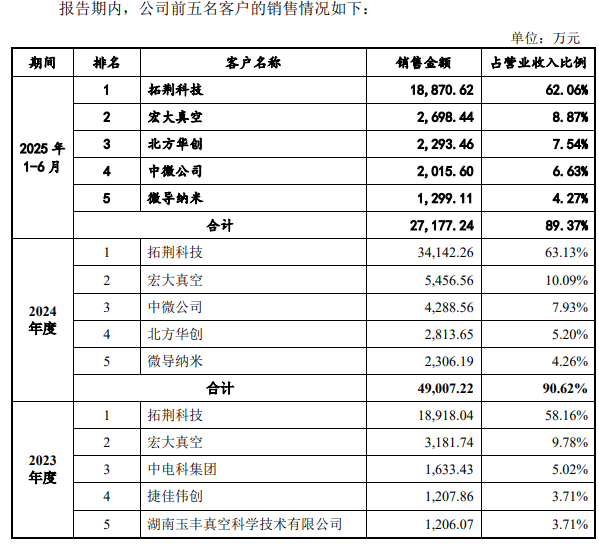 更需关注的是,恒运昌超六成收入来自其第一大客户拓荆科技。2022年至2024年及2025年上半年,该公司向拓荆科技销售收入分别为7153.8万元、1.89亿元、3.41亿元及1.89亿元,占当期营收比重分别为45.23%、58.16%、63.13%和62.06%。