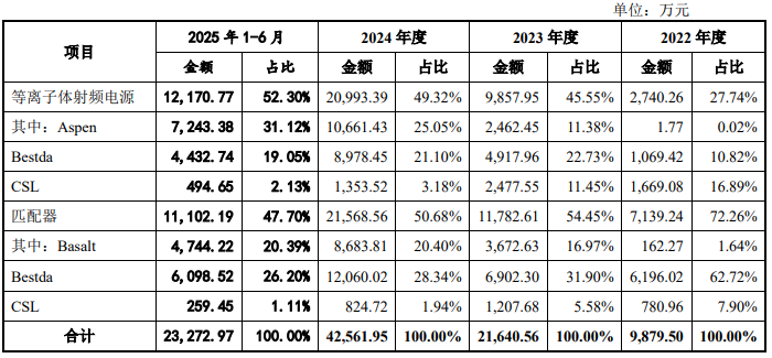 恒运昌已自研推出CSL、Bestda、Aspen/Basalt三代等离子体射频电源系统系列产品。其中,目前主要产品Bestda、Aspen/Basalt两代产品,主要面向半导体领域;CSL系列主要用于光伏电池片薄膜沉积、显示面板镀膜、精密光学镀膜等领域。