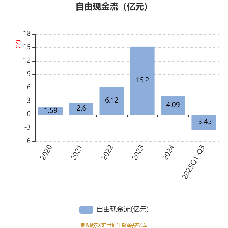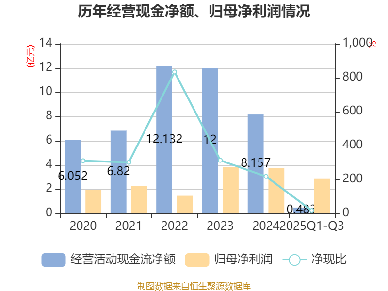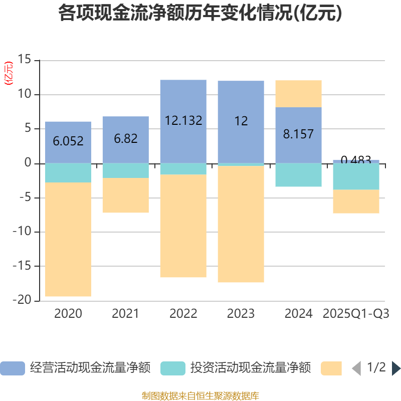 2025年前三季度,公司经营活动现金流净额为4833.67万元,同比下降84.64%;筹资活动现金流净额-3.42亿元,同比减少8.13亿元;投资活动现金流净额-3.86亿元,上年同期为-4.34亿元。