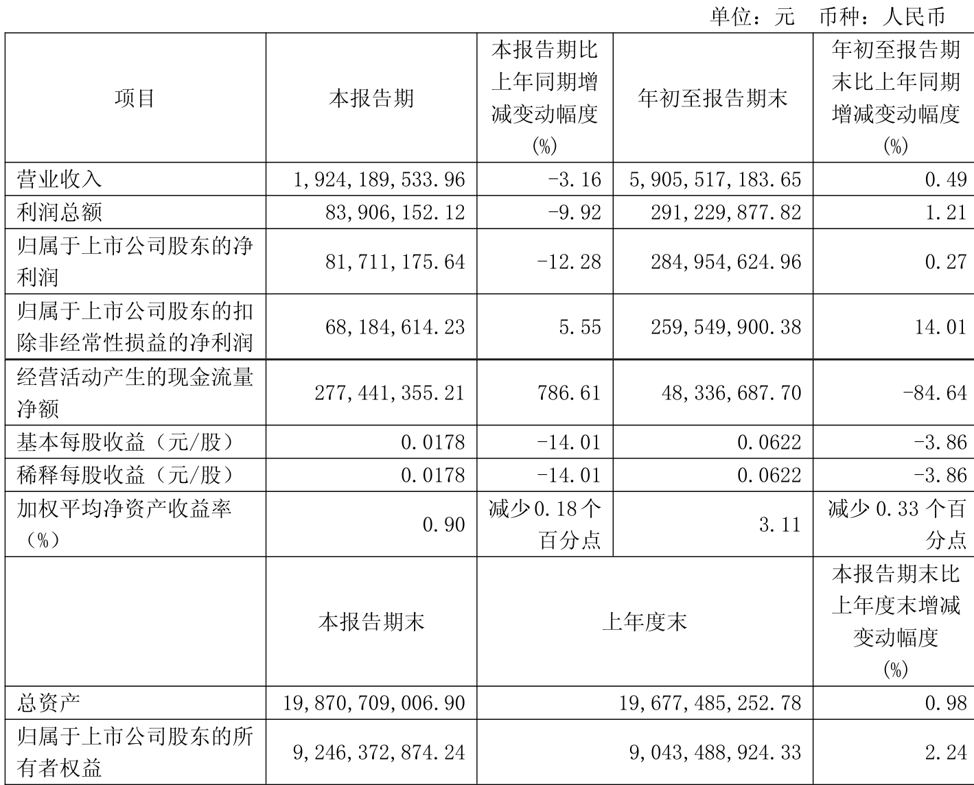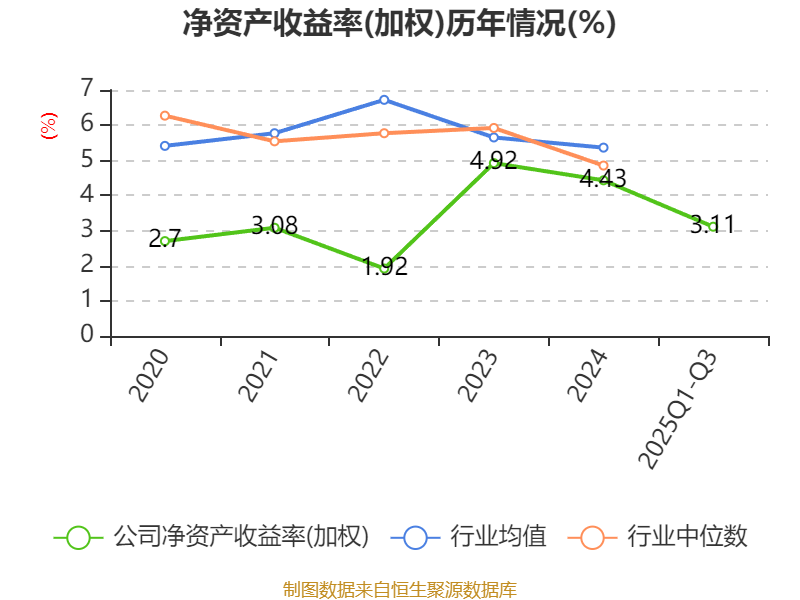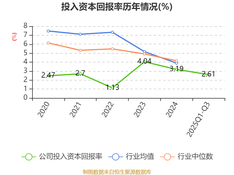 盈利能力方面, 2025年前三季度公司加权平均净资产收益率为3.11%,同比下降0.33个百分点。公司2025年前三季度投入资本回报率为2.61%,较上年同期下降0.18个百分点。