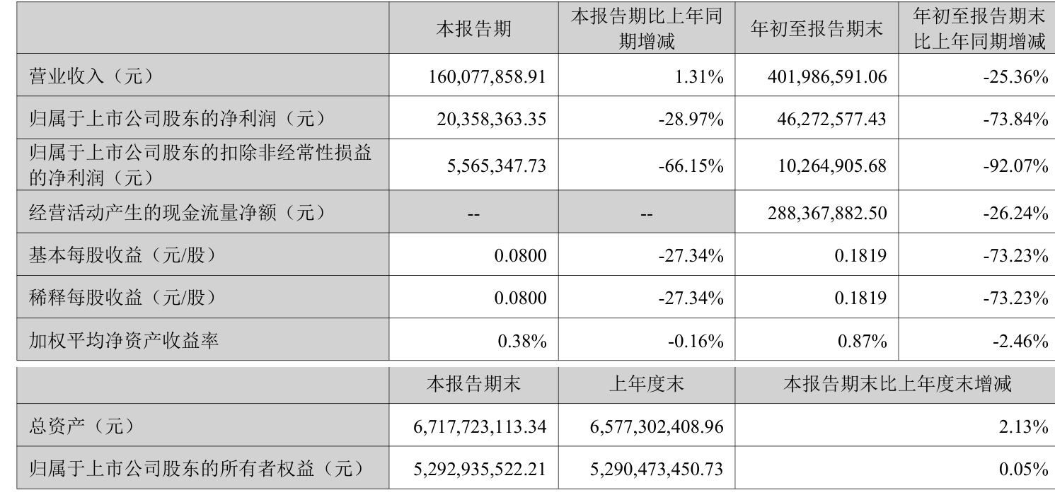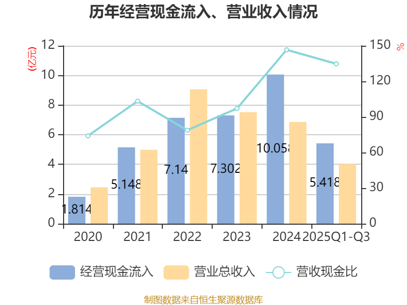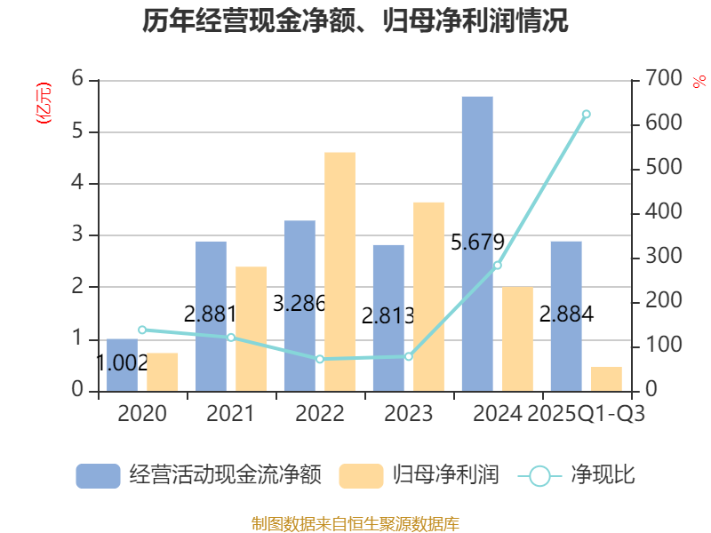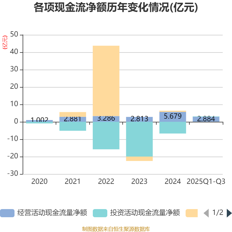 2025年前三季度,公司经营活动现金流净额为2.88亿元,同比下降26.24%;筹资活动现金流净额-464.57万元,同比减少5157.53万元;投资活动现金流净额2200.87万元,上年同期为-2.09亿元。