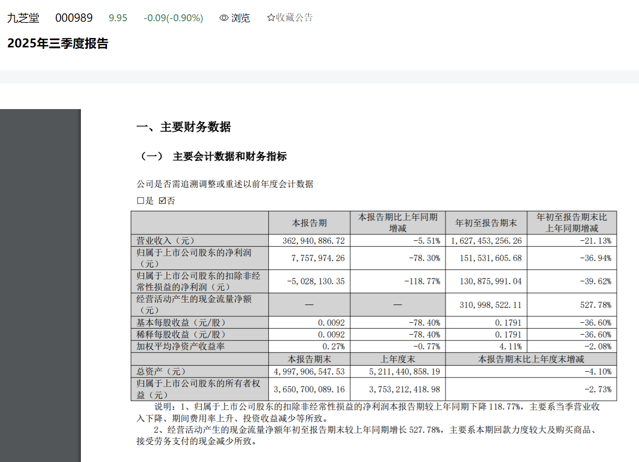 九芝堂10月29日晚间发布了2025年三季报,第三季度公司延续了上半年的业绩下滑势头,营收与净利双双下滑。公司今年前三季度净利因此受拖累下滑近四成,完成业绩对赌条款的压力大增。