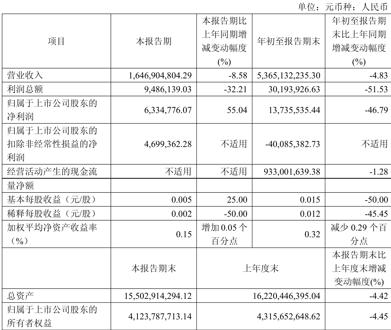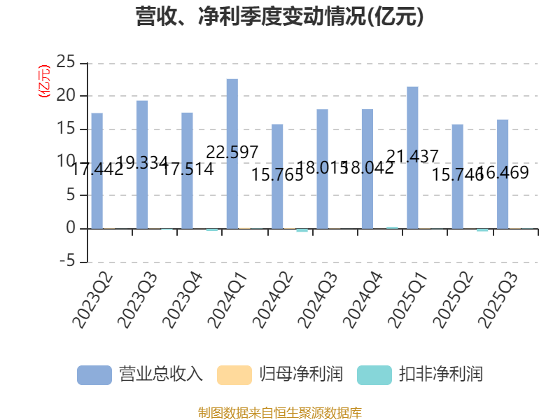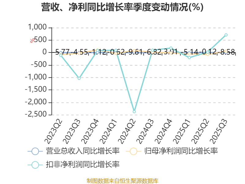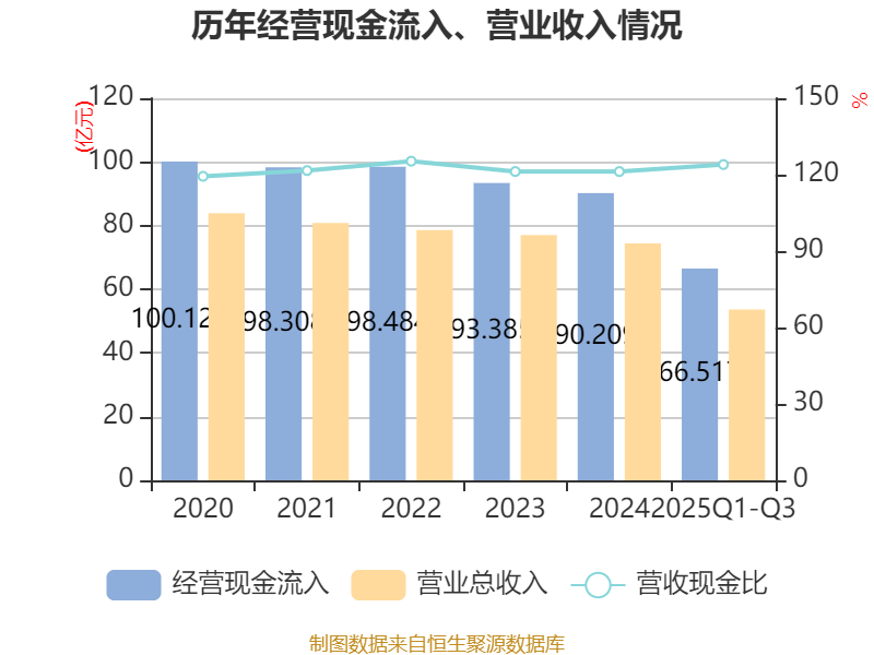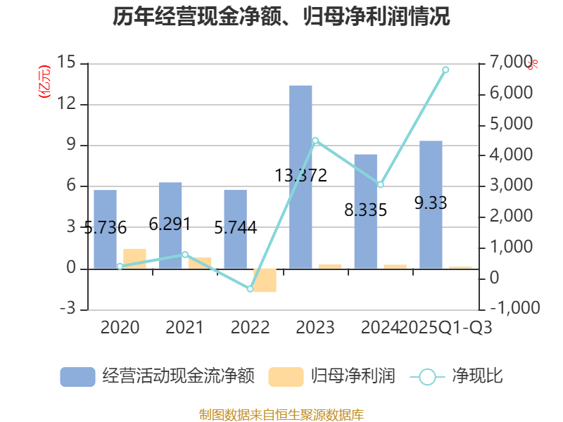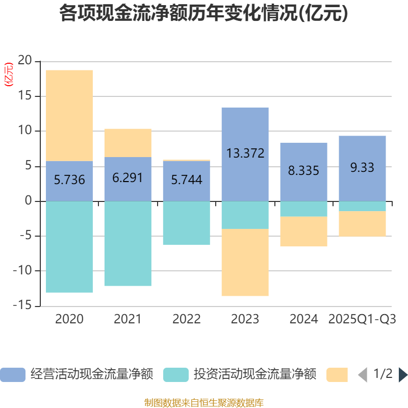 2025年前三季度,公司经营活动现金流净额为9.33亿元,同比下降1.28%;筹资活动现金流净额-3.61亿元,同比减少1.2亿元;投资活动现金流净额-1.45亿元,上年同期为-1.85亿元。