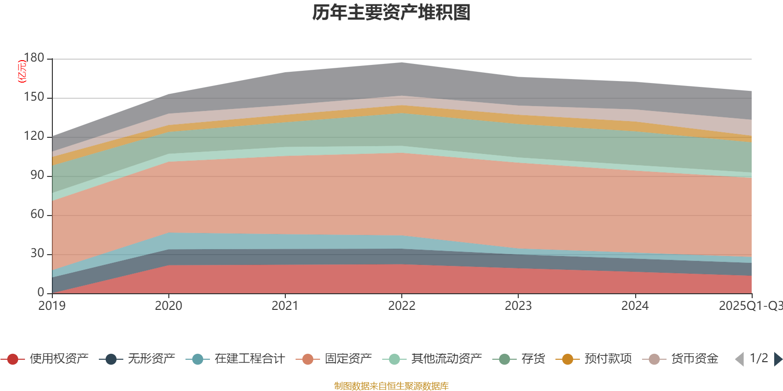 资产重大变化方面,截至2025年三季度末,公司货币资金较上年末增加33.15%,占公司总资产比重上升2.24个百分点;使用权资产较上年末减少18.38%,占公司总资产比重下降1.48个百分点;预付款项较上年末减少33.03%,占公司总资产比重下降1.39个百分点;存货较上年末减少10.24%,占公司总资产比重下降0.97个百分点。
