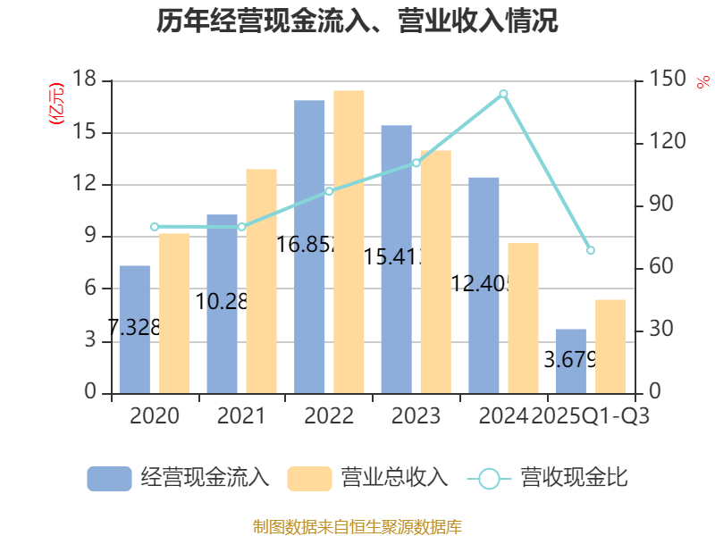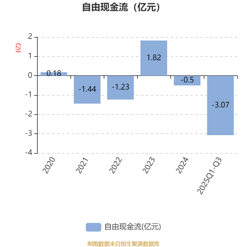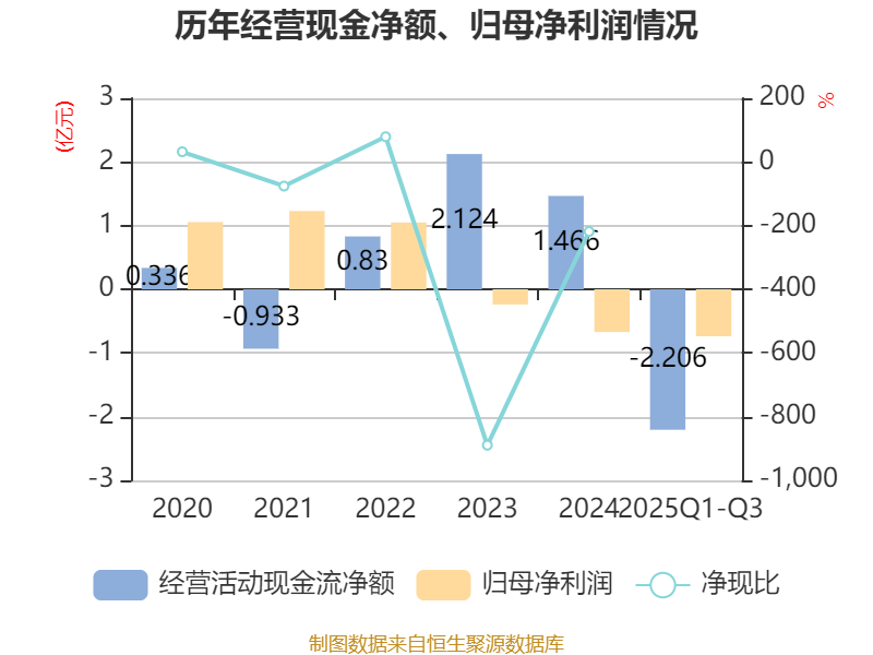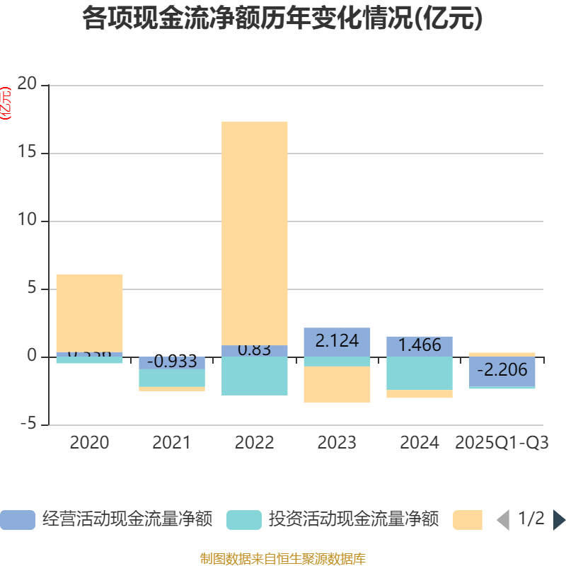 2025年前三季度,公司经营活动现金流净额为-2.21亿元,同比减少4.33亿元;筹资活动现金流净额2901.96万元,同比增加7338.59万元;投资活动现金流净额-1527.36万元,上年同期为-1.72亿元。