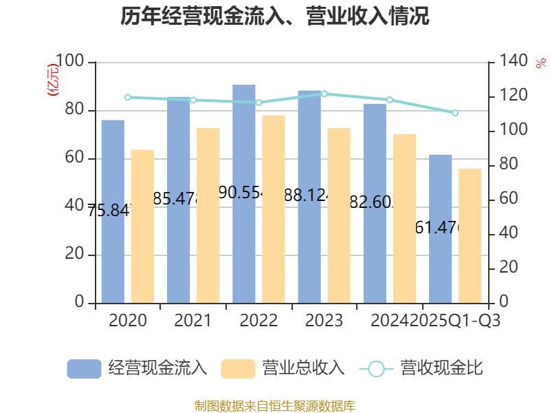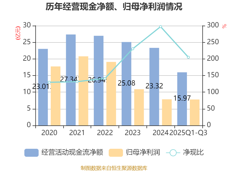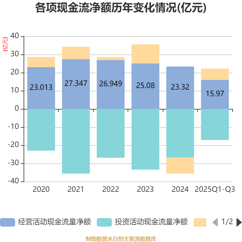 2025年前三季度,公司经营活动现金流净额为15.97亿元,同比增长26.55%;筹资活动现金流净额6.23亿元,同比增加12.46亿元;投资活动现金流净额-17.16亿元,上年同期为-22.91亿元。