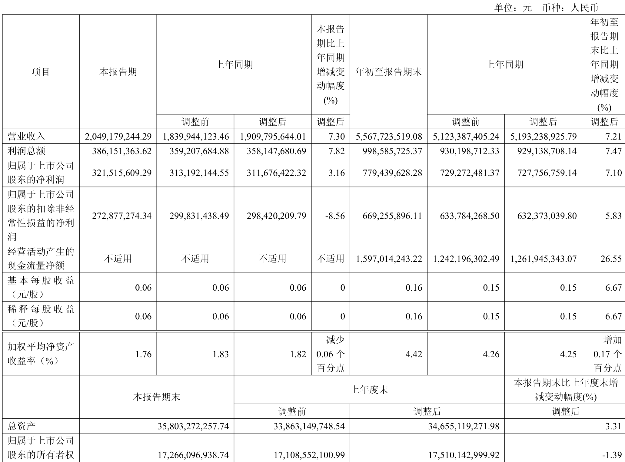 中证智能财讯重庆水务(601158)10月30日披露2025年第三季度报告。前三季度公司实现营业总收入55.68亿元,同比增长7.21%;归母净利润7.79亿元,同比增长7.10%;扣非净利润6.69亿元,同比增长5.83%;经营活动产生的现金流量净额为15.97亿元,同比增长26.55%;报告期内,重庆水务基本每股收益为0.16元,加权平均净资产收益率为4.42%。