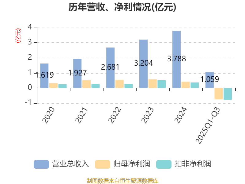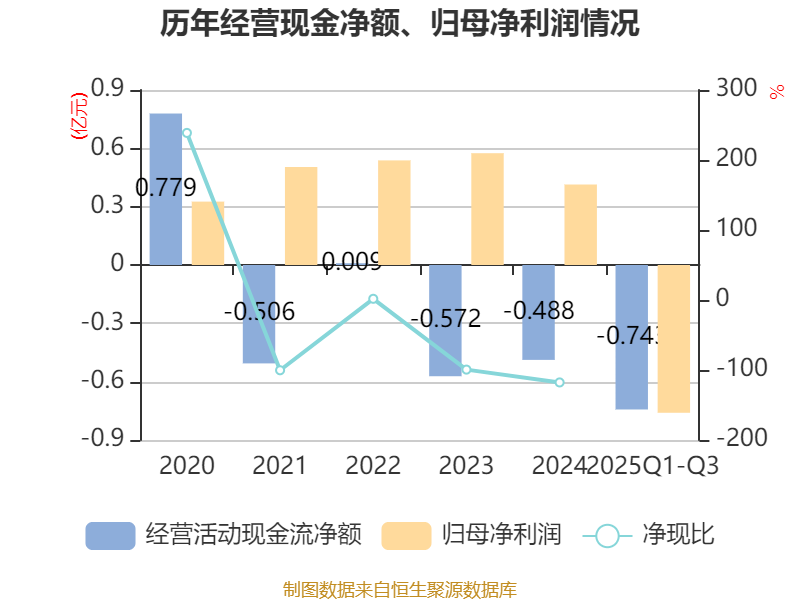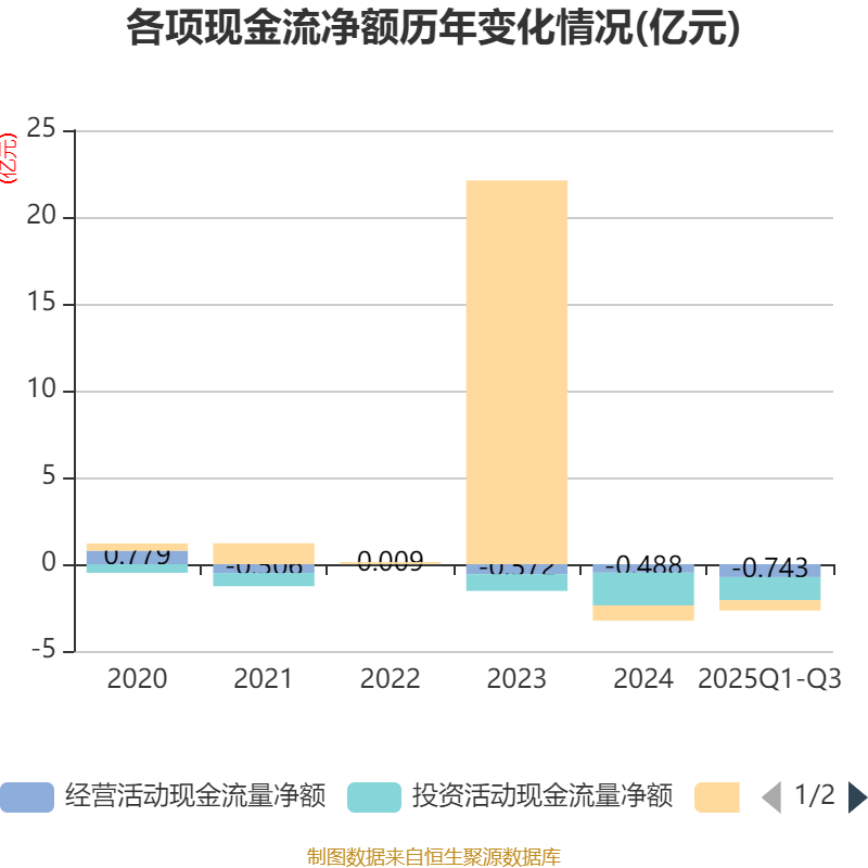2025年前三季度,公司经营活动现金流净额为-7430.17万元,同比增加1281.55万元;筹资活动现金流净额-5983.85万元,同比增加69.74万元;投资活动现金流净额-1.33亿元,上年同期为-1.27亿元。