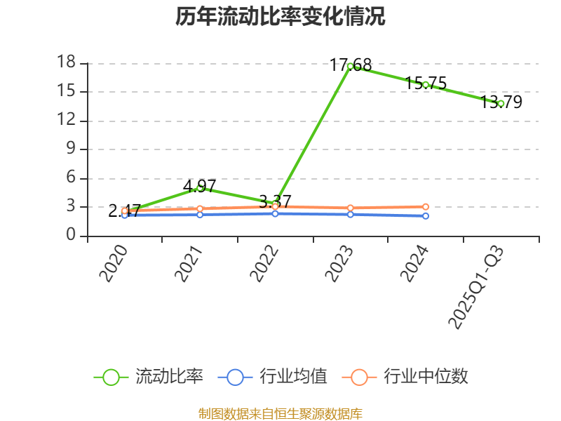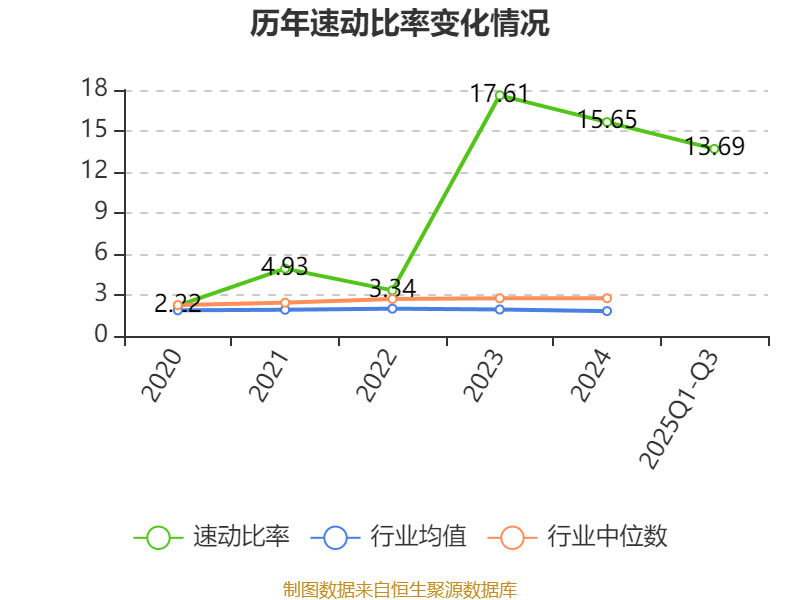 2025年前三季度,公司流动比率为13.79,速动比率为13.69。
