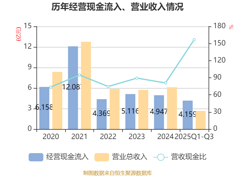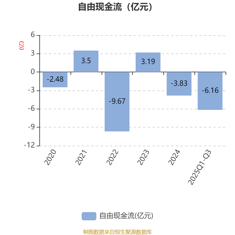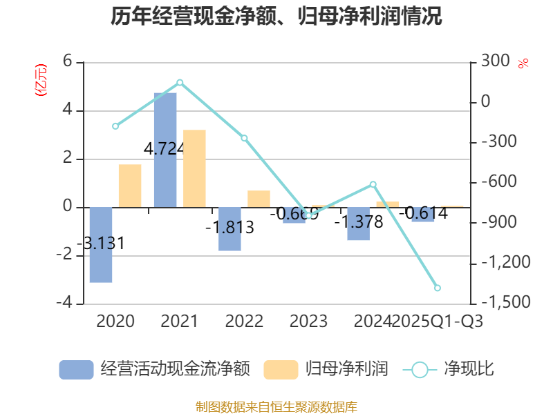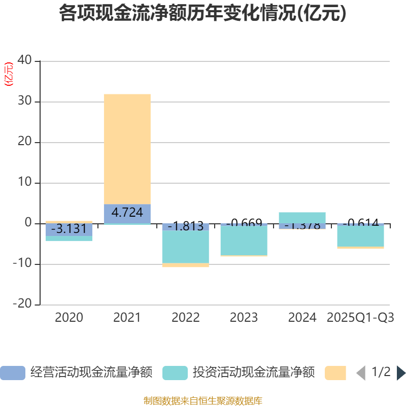2025年前三季度,公司经营活动现金流净额为-6143.13万元,同比增加7383.53万元;筹资活动现金流净额-5061.7万元,同比减少4775.51万元;投资活动现金流净额-5.13亿元,上年同期为-12.34亿元。