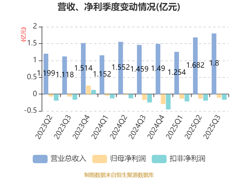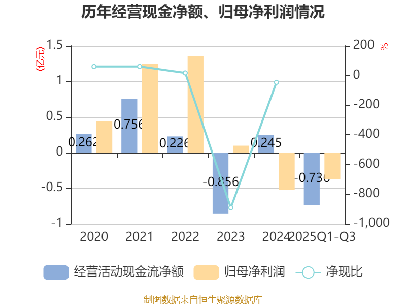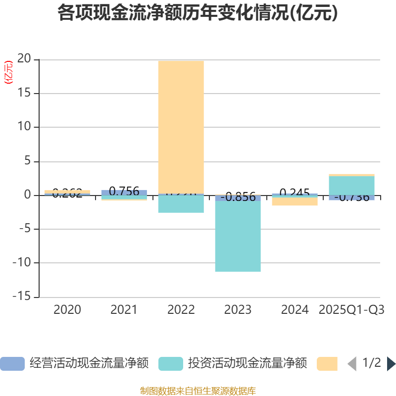 2025年前三季度,公司经营活动现金流净额为-7358.74万元,同比减少741.91万元;筹资活动现金流净额2882.59万元,同比增加9217.7万元;投资活动现金流净额2.82亿元,上年同期为-2.92亿元。