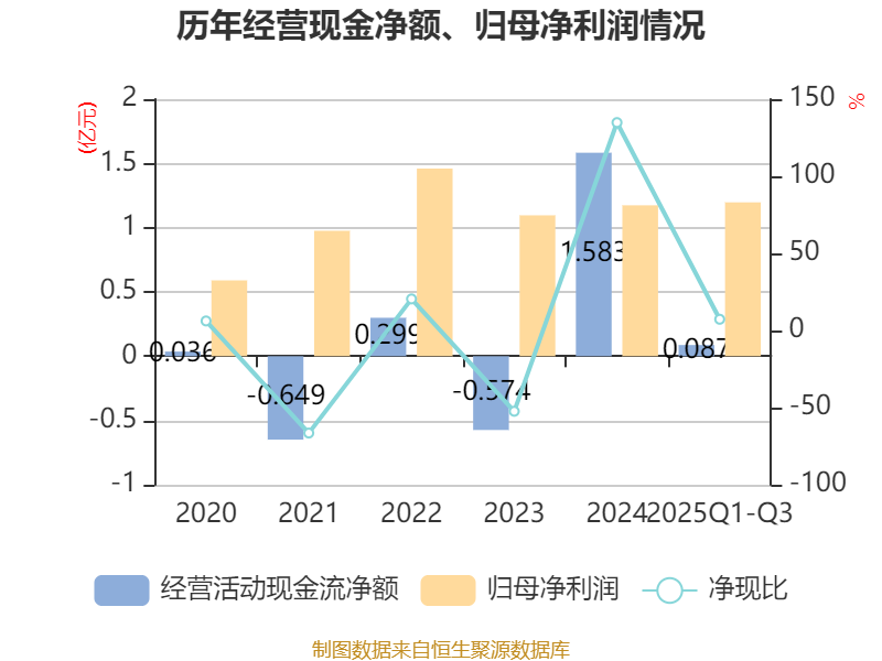 2025年前三季度,公司经营活动现金流净额为873.27万元,同比下降91.32%;筹资活动现金流净额-2992.02万元,同比增加1.06亿元;投资活动现金流净额-1.18亿元,上年同期为-3.5亿元。
