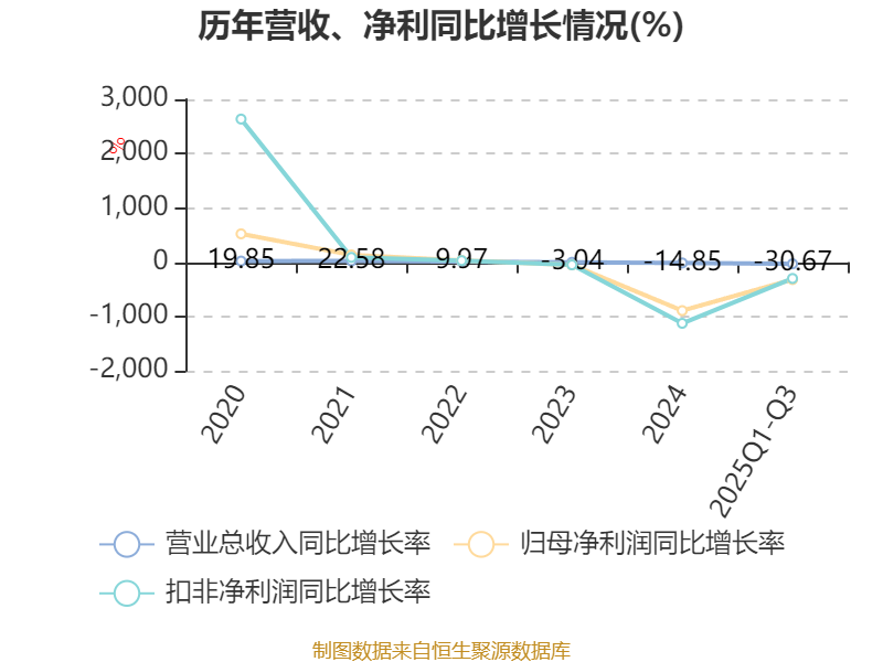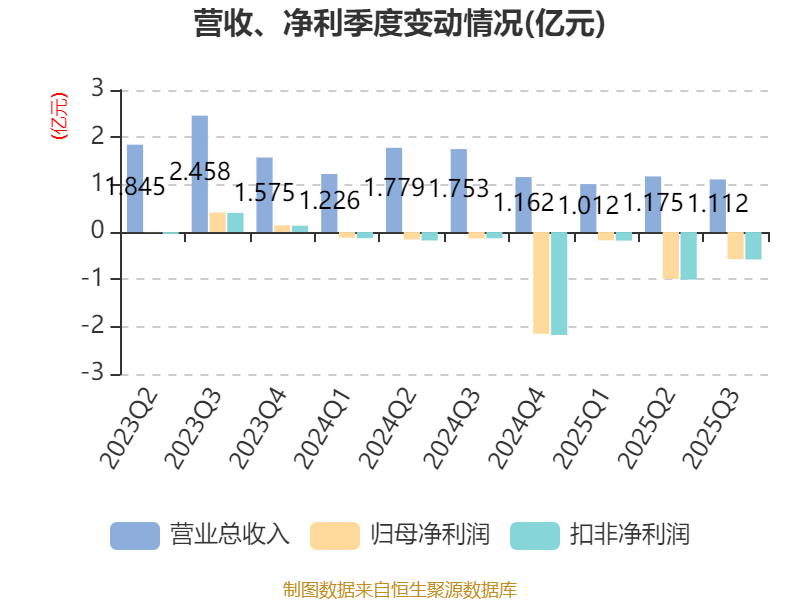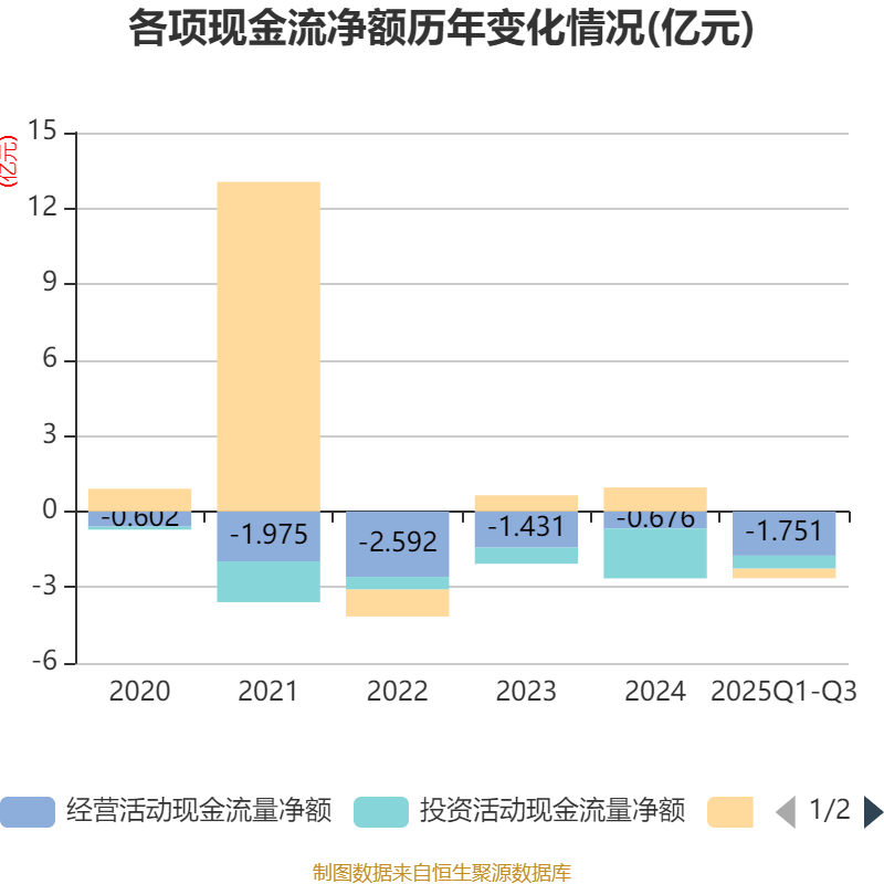 2025年前三季度,公司经营活动现金流净额为-1.75亿元,同比减少1279.46万元;筹资活动现金流净额-3782.45万元,同比减少1.03亿元;投资活动现金流净额-5151.03万元,上年同期为-1.49亿元。